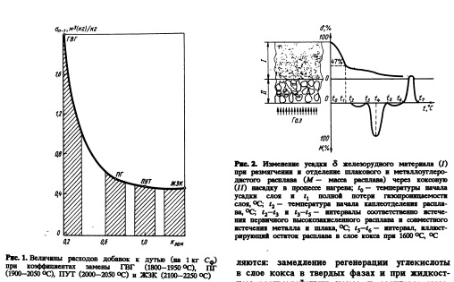 ОБ УСЛОВИЯХ ПОВЫШЕНИЯ ЭФФЕКТИВНОСТИ ЗАМЕНИТЕЛЕЙ КОКСА В ПРОЦЕССАХРасчетноаналитическими и экспериментальными исследованиями по разработанным методикам установлено, что эффективность заменителей кокса (ГВГ, ПГ, ПУТ, ЖЗК) повышается за счет придания соответствующих металлургических, в частности, высокотемпературных свойств железорудным материалам и коксу. Приведены условия, обеспечивающие повышение эффективности добавок к дутью.Реализация сложившейся стратегии коренного улучшения энергоиспользования в доменном производстве за счет внедрения добавок к дутью, таких как пылеугольное топливо (ПУТ), горячие восстановительные газы (ГВГ), жидкие заменители (ЖЗК) и повышение эффективности применения природного газа (ПГ) предопределяет придание соответствующих свойств (в частности, высокотемпературных) железорудным материалам и коксу, которые обусловливают наиболее эффективное использование указанных добавок к дутью. С целью установления общей ситуации, исходных положений и параметров процесса, определяющих поведение железорудных материалов и кокса в различных зонах доменной печи в условиях применения различных добавок к дутью, выполнена серия прогнозных термодинамических и металлургических расчетов показателей и параметров доменной плавки, результаты которых явились базой для выполнения экспериментальных и расчетнотеоретических исследований. При этом ограничились рассмотрением четырех главных заменителей кокса: ГВГ, ПГ, ПУТ, ЖЗК (мазут). Исходя из анализа имеющихся в литературе сведений об особенностях технологии плавки, при каждом из указанных видов дополнительного топлива проведена их ранжировка по коэффициенту замены кокса и определяющим параметрам. На рис. 1 приведена схема, показывающая принятые в расчетах изменения расхода добавки к количеству углерода кокса, сгорающего у фурм 5, при соответствующих коэффициентах замены Кзлм и теоретических температурах у фурм Тт. Выполненные исследования показали, что энергетическое состояние процесса плавки и расход кокса на фурмах при разных добавках к дутью в значительной мере обусловливаются металлургическими, в том числе высокотемпературными свойствами шихтовых материалов. Для их определения разработаны методики и соответствующее аппаратурное оформление. При этом комплексным изучением процессов взаимодействия шихтовых материалов для условий развивающихся технологий выявлены особенности и закономерности: твердофазное взаимодействие кокса и кислорода руды; твердофазное взаимодействие кокса с газообразными окислителями при переменном нагреве и приложении механической нагрузки; формирование расплавов из железорудных материа!юв разного состава на коксовой насадке различного качества; взаимодействие шлакового расплава разного состава и кокса различных свойств; влияние параметров зоны когезии на газодинамику столба материалов в нижней зоне доменной печи (плоская модель) и др.