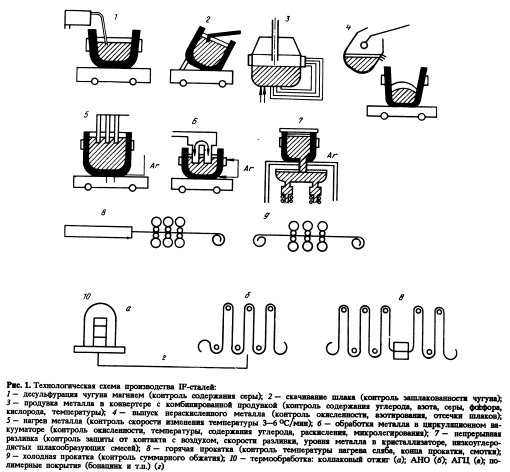 Кроме титана в сталь можно вводить ниобий при соответствующем снижении содержания титана. При данном химическом составе и правильно подобранных режимах горячей и холодной прокатки, термообработки обеспечивается возможность получения высоких показателей штампуемости ( Наибольшего прогресса в производстве холоднокатаных сверхнизкоуглеродистых сталей, стабилизированных титаном и ниобием, достигли на Новолипецком металлургическом комбинате. Массовое производство IFсталей потребовало высокого уровня металлургической технологии, что явилось показателем такого уровня. При этом исходили из принципиального положения, что за счет только одного какоголибо технологического передела невозможно обеспечить высокое качество готовой продукции. При освоении новой металлопродукции речь должна идти только о сквозных технологиях и комплексном изучении потребительских свойств готовой продукции для формирования спроса потребителя. Реализованная в промышленных условиях схема производства IFсталей представлена на рис.1.