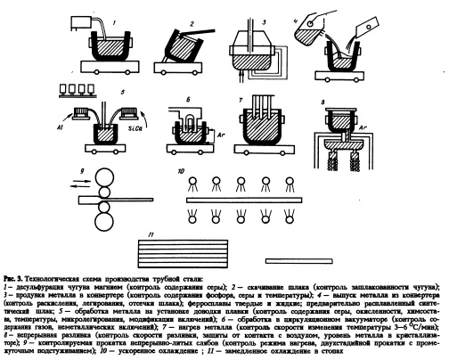 В настоящее время для ВМЗ разработаны основные технологические схемы производства штрипсов толщиной 14—16 мм, шириной 3200 мм категории прочности К60 по кооперации HJIMK (выплавка и разливка) и Ижорский завод (контролируемая прокатка). На НЛМК производство заготовки для стана 5000 из стали 10Г2ФБЮ осуществляется по технологической схеме, предусматривающей выплавку полупродукта в 180т кислородных конвертерах, вне печную обработку на УДМ с продувкой металла порошкообразным силикокальцием в струе аргона и непрерывную разливку в кристаллизатор сечением 240x1550 мм. На стане 5000 предложенная технология включает нагрев однократный слябов в печах с выкатным подом до 1180—1200°С в течение 1012 ч и последующую контролируемую прокатку с завершением деформации при 770—710°С. Проведено опробование предложенной технологической схемы при производстве штрип сов из стали 10Г2ФБЮ, показавшее ее перспективность для организации на ВМЗ производства хладостойких труб диаметром 1020 мм. Основные технологические параметры схемы можно использовать для штрипсов толщиной 3036 мм для морского участка газопровода. При выплавке стали для штрипсов реализуется полный цикл внепечной обработки, включающий отсечку конвертерного шлака при выпуске металла из конвертера; использование сталеразливочных ковшей с высокоглиноземистой футеровкой; обработку металла синтетическим шлаком при выпуске из конвертера; применение жидких ферросплавов; перемешивание металла аргоном с целью выравнивания химического состава и температуры, повышения чистоты по неметаллическим включениям; продувку порошкообразным силикокальцием фракции 0—1,5 мм в среде аргона; корректировку химического состава на УДПК; использование теплоизолирующих крышек. Реконструкция установок непрерывной разливки направлена на снижение ликвационной неоднородности и повышение толщины слябов (до 300 мм). Годовая потребность в штрипсах 200250 тыс.т может быть обеспечена со стана 5000 Ижорского завода за счет поэтапного ввода недостроенного технологического оборудования. На первом этапе (производство штрипсов до 100 тыс.т/год): завершение строительства нагревательных колодцев и адъюстажного пролета с термическими печами и ультразвуковой установкой; замена действующей станины клети кварто 5000 на станину повышенной прочности. На втором этапе (производство штрипса до 150 тыс.т/год): удлинение цеха с установкой черновой клети дуо, ножниц поперечной резки, правильной машины для правок листов толщиной 10—50 мм в потоке стана, передаточных шлепперов, огнерезных и зачистных машин. На третьем этапе (завершение строительства первой очереди с выходом на проектную мощность 370 тыс.т в год, в том числе штрипсов 200 тыс.т/год): установка второй правильной машины в потоке стана, ножниц продольной резки, термических проходных печей, роликовой закалочной машины и УЗК в потоке стана. Освоение производства этого вида металлопродукции позволяет подготовить техническую базу для освоения других месторождений газа в России (Обская губа, Сахалинский шельф, Чукотка—Корея и др.). Таким образом, предприятия черной металлургии России в состоянии в полном объеме обеспечить потребности этих и других ведущих отраслей промышленности для реализации крупных государственных проектов и программ высококачественным металлом. Реализации предложенны