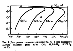 В качестве летучего металла, образующего твердые сульфиды и оксиды/ выбрали цинк, температура кипения которого 906 °С. Содержание цинка в ряде используемых шихтовых материалов, в частности в конвертерных шла мах, достигает нескольких процентов, что позволяет использовать его в качестве связующего серы. В зависимости от соотношения сульфидной и оксидной частей газовой фазы в твердом виде могут выделяться ?001200 °С не превышает 0,001 Па, а сульфида цинка изменяется от 0,001 до 100 Па. Относительно высокие значения давления насыщенного пара ZnS приводят к тому, что определенная часть сульфида присутствует над твердой фазой в виде пара.