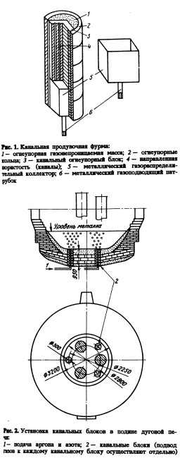 ОПЫТ ИСПОЛЬЗОВАНИЯ В ЭЛЕКТРОСТАЛЕПЛАВИЛЬНЫХ ЦЕХАХ РОССИИ СОВРЕМЕННЫХ ДОСТИЖЕНИЙ МЕТАЛЛУРГИЧЕСКОГО ПРОИЗВОДСТВАПриведен анализ опыта работы ряда зарубежных элекгросгалеплавильных цехов. Показан высокий уровень исполнения технологий производства электростали и оборудование для их реализации. Описаны конструкторские решении, по пенам и электрооборудованию, использование продувки стали газом через подину печи, применение кислорода до расхода ~ 30 м3/т стали, достижение высокой стойкости огнеупоров и изделий из них, новые достижения в экологии производства стали в элекгросгалеплавильных цехах.В России по существу действует один современный электроцех (на ВТЗ), в некоторой степени можно также отнести к этой группе цехов — цех на ОЭМК, работающий на металлизованных окатышах. Развитие выплавки и внепечной обработки электростали в России направлено на снижение энергозатрат, огнеупоров, электродов, ферросплавов и, следовательно, себестоимости электростали, а также повышение качественных характеристик по чистоте стали и росту производительности печей. Известное разделение процессов плавления, окисления и доводки стали по агрегатам стало аксиомой при сооружении новых цехов. Использование новых приемов и оборудования в условиях давно действующих цехов и недавно введенных в эксплуатацию существенно отличаются по сложности и окончательному результату внедрения. Это можно проследить по проведенным работам на Череповецком и Оскольском металлургических комбинатах. Тем не менее, в любом случае уровень техникоэкономических показателей выплавки стали по новым технологиям довольно значителен. Так, на Череповецком и Оскольском металлургических комбинатах в электросталеплавильных цехах со 100—150т дуговыми печами проведена впервые в России работа по созданию оборудования для продувки металла газами через канальные блоки или фурмы, устанавливаемые в подине печи. Для этого разработаны технологии изготовления канальных блоков, системы монтажа блоков в подине дуговой печи и подачи газов в печь. Были изготовлены из периклазовых и пе риклазоуглеродистых огнеупоров канальные продувочные фурмы (рис.1). Схема их установки в подине печи показана на рис.2. Ниже приведены показатели работы 100т печи с применением канальных фурм в подине дуговой печи при выплавке конструкционной (24 плавки) (числитель) и нержавеющей стали (10 плавок) (знаменатель):