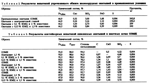 В 19841990 гг. ОЭМК, ЦНИИчерметом и Ме ханобрчерметом был проведен цикл работ по созданию офлюсованного сырья для металлизации в шахтных печах. В качестве флюсующих агентов были опробованы гашеная известь, известняк. В случае использования гашеной извести показано, что введение 2,4—3 %ной добавки позволяет вывести из шихты бентонит. Во избежание переоплавления температуру обжига рекомендуется поддерживать на уровне 1190—1220 °С, а температуру в зоне сушки II 300—310 °С. В результате промышленных испытаний было получено более 6000 т пригодных для металлизации в шахтных печах окатышей с прочностью 3,01 кН на окатыш с содержанием Fe0<0,4% и S = 0,004%. Известняк в промышленных масштабах подавался по тракту бентонита. Обжиг окатышей производился при температуре в зоне обжига до 1190 °С, зоне сушки II — 290—300 °С. Произведено 18000 т пригодных для металлизации в шахтных печах окатышей с прочностью 2,7 кН на окатыш и содержанием FeO < 0,26 %; S а 0,004%. Проведены промышленные испытания технологии металлизации офлюсованного железорудного сырья в шахтных печах ОЭМК. При температуре восстановительного газа 880—890 °С и равной производительности 58,2 т/ч — степень использования восстановительного газа и метана за один проход через печь в случае офлюсованных окатышей повысилась на 11,5 и 16,2 % соответственно. Расход восстановительного и природного газов на тонну металлического железа снизился на 11,5 и 24,2%. Снижение расхода природного газа произошло в меньшей мере, чем увеличение степени его использования, так как это касается только той части метана, которая подается непосредственно в печь (в данном случае 35,4% от общего). Результаты лабораторных и промышленных исследований по металлизации позволяют сделать вывод о том, что использование офлюсованного сырья целесообразно при повышенных температурах металлизации 860—900 °С, когда они обладают лучшим комплексом металлургических свойств по сравнению с неофлюсован ными. Исследования по использованию КМЦ в качестве связующего показали, что окатыши имеют прочность, соизмеримую с базовыми окатышами (с бентонитом) при температуре обжига 1220—1250 °С и расходе КМЦ 0,1— 0, 15 %. Так при этих температурах обжига прочность окатышей с КМЦ составила 206— 211 кг/окатыш, а для окатышей с бентонитом 212 кг/окатыш (нонтронитовая глина— 156— 207 кг/окатыш). Исследования металлургических свойств нового вида сырья в лаборатории показали, что их восстановимость не менее чем на 10% выше соответствующего базового показателя. Для металлизованных окатышей, предназначенных на экспорт, приобретает большое значение склонность окатышей к вторичному окислению во влажном состоянии. Так, для металлизованного сырья, полученного с использованием КМЦ, реакционная способность в состоянии полного влагонасыщения составляет 1,4 м3 02/сут, что на 1020% ниже, чем для окатышей с бентонитом. Для более тщательной проверки этого положения в промышленных условиях был произведен натурный эксперимент. Упрочняющий обжиг окатышей проводился на обжиговой мап!ине фирмы "Лурги", имеющей ширину 4 и длину 120 м. Исследовательские окатыши загружались на донную постель и следовали в технологическом потоке до выгрузки. Скорость обжиговой машины составила 2,1 м/мин, а температура в зоне обжига 1200 °С (табл. 2). Окисленные окатыши, полученные с использованием КМЦ, пропускали через шахтную печь в мягки