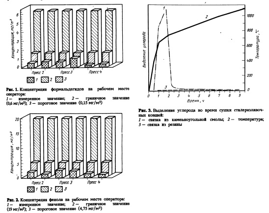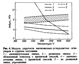 Посредством очистки отходящих газов, выделяющихся при сушке, в фильтре с активированным древесным углем, максимально допустимые значения выбросов находятся ниже предельных концентраций. Для заказчика экологические преимущества заключаются в значениях концентраций углерода, связанного в органические соединения, измеренные FID (детектором ионизации пламени) во время сушки ковшей. Тогда как концентрация выделяющегося органического углерода возрастает до 1000 ppm в начале сушки при использовании огнеупоров на связке из каменноугольной смолы, огнеупоры на полимерной связке показывают в 100 раз меньшее значение (рис. 3). Это ясно показывает, что пиролиз полимеров проходит гораздо менее, чем каменноугольной смолы, так что и концентрация выделяемых вредных веществ имеет значительно меньшее значение. Другой причиной низкой концентрации выделяющихся веществ от изделий на полимерной связке является то, что полимерная связка используется исключительно для получения необходимой стабильности изделий, т.е. только половина количества связующего необходима по сравнению с использованием каменноугольной смолы, которая в этом случае дополнительно используется и как источикуглерода. Другим преимуществом является то, что при использовании полимерного связующего не происходит выделения бензопирена. Интенсивные смесители, используемые Refratechnik, обеспечивают равномерное распределение составляющих, что является ос новным условием получения в дальнейшем хорошей смачиваемости. Сами резолы являются постоянным объектом исследований, их уровень конденсации увеличивается, в то время как содержание несвязанного фенола уменьшается до минимума; выделение вредных веществ будет постоянно уменьшаться. Содержание несвязанного фенола с первоначальных 8% может быть снижено до 5%. Хотя фенольные резолы с содержанием несвязанного фенола менее 5% имеются на рынке, они пока непригодны для наших целей, так как имеют низкую смачиваемость и малое время стабильности при производстве. Для достижения максимальной стабильности после коксования рекомендуется использовать связующее с максимальным коксовым остатком. Это положение подтверждается проведенными разнообразными исследованиями, которые также показали, что возможность улучшения холодной прочности огнеупоров после коксования относительно мала при использовании различных типов фенольной резины. Это объясняется пространственной структурой углерода, возникающей при пиролизе фенольной резины, которая в этом случае более отличается от идеальной структуры графита, чем продукты приролиза каменноугольной смолы. Это также объясняет, почему холодная прочность огнеупоров на полимерной связке в зависимости от вида до 50% ниже, чем у огнеупоров на связке из каменноугольной смолы. Более важный для характеристики службы огнеупоров показатель прочности на изгиб в горячем состоянии показывает совершенно другие результаты. На рис. 4 приведена диаграмма, которая показывает величину прочности на изгиб в горячем состоянии в интервале температур 1000—1500 °С.