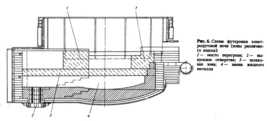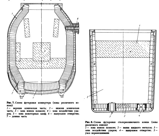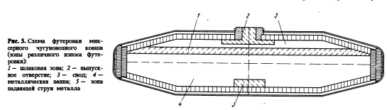 Конвертер Огнеупоры с содержанием 50—90 % плавленной магнезии подвержены повышенному износу в зоне под электродами. Процентное количество плавленной магнезии может быть уменьшено в среднем до 25% в сортах огнеупоров, предназначенных для промежуточных зон, которые не подвержены повышенным нагрузкам. Количество плавленной магнезии для зоны контакта со шлаком следует выбирать в зависимости от шлакового режима. Использование изделий MACARBON с содержанием углерода не менее 10 %, с добавлением 25—50 % плавленной магнезии (если это является необходимым) для противодействия агрессивному шлаку обеспечивает равномерный износ футеровки. Как правило, зоны контакта с металлом не требуют повышения износостойкости огнеупоров путем добавления плавленной магнезии. Обычно мы рекомендуем футеровать зону контакта с металлом теми же огнеупорами, которые используются в шлаковой зоне. В некоторых случаях, однако, наилучшие показатели стойкости/стоимости футеровки зоны металлической ванны могут быть получены при использовании сорта MACARBON с 5% С. углерода не менее 10 %. Наиболее равномерный Первоначально только футеровку зоны цапф проводили огнеупорами MACARBON, изготовленными на основе высокоплотной чистой спеченной магнезии с содержанием 10% С. Изза прекрасного срока службы огнеупоров, полученных на нескольких заводах, в этой зоне, подверженной повышенному износу, мы были в дальнейшем основными поставщиками всей футеровки конвертеров (рис. 7). Для футеровки конвертеров рекомендуется использовать сорт MACARBON с содержанием износ футеровки в шлаковой зоне достигается при использовании огнеупоров с 25—50 % плавленной магнезии и в зоне под цапфами — при использовании огнеупоров с увеличенным количеством плавленной магнезии на 25%. Зона загрузки скрапа известна как наиболее подверженная механическим нагрузкам. Хорошие результаты в этой зоне получены при использовании изделий MACARBON на основе крупнокристаллической спеченной магнезии с добавлением пассиваторов, стабилизирующих структуру огнеупоров. В случае повышенных термохимических нагрузок рекомендуется использовать соответствующий сорт огнеупоров с 25—50% плавленной магнезии. Зная характер износа футерови, ее состав можно регулировать. Например, результаты исследований работы некоторых конвертеров показали, что вводить пассиваторы в состав футеровки не требуется. В других зонах оптимальное соотношение стоимости и срока службы может быть получено при использовании менее дорогих изделий MACARBON на основе спеченной магнезии, изготовленной из природного магнезита. В некоторых случаях успешно проведена оптимизация соотношения стоимости и срока службы путем использования огнеупоров с уменьшенным до 5% содержанием углерода. Но в любом случае необходимо знать профиль износа наших изделий, прежде чем мы сможем дать рекомендации по оптимальной конструкции футеровки. Рекомендуется выполнять кладку огнеупоров в соответствии с новой конструкцией (наклонная футеровка). По сравнению с обычной горизонтальной кладкой в верхней и нижнем конических частях конвертера кирпичи кладутся под углом, параллельным направлению износа футеровки. Этот метод не только предотвращает повышенный износ футеровки, выполненной в форме ступенек при обычной кладке, но также позволяет более эффективно использовать общу
