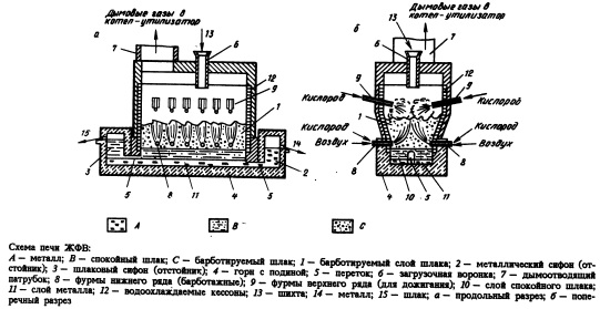 Восстановление железа идет из шлакового расплава, содержащего постоянно не более 3 % FeO. При эксплуатации в условиях нормальной работы обслуживающих систем расход энергетического угля на тонну чугуна находится в пределах 650—850 кг, а кислорода 600750 м3 в зависимости от содержания железа в шихте и степени дожигания восстановительных газов в агрегате. Производственная эксплуатация агрегата полностью подтвердила принципы, заложенные при разработке процесса. Среди них: возможность осуществления процесса с получением чугуна одностадийным способом в одном агрегате с потерями железа в отходящем шлаке не выше 2,0%; протекание процесса восстановления железа углем в шлаковой ванне, барботируемой кислородосодержащим дутьем при окислении угля в ванне до СО; использование дожигания восстановительных газов (СО и Hj), выделяющихся из шлаковой ванны, над ванной с возвращением в нее необходимого тепла; осуществление в агрегате непрерывного процесса получения чугуна при непрерывной загрузке шихты и угля и непрерывном одновременном раздельном выпуске чугуна и шлака. Исследования износа обычной огнеупорной футеровки показали, что ее минимальная стойкость при непрерывной работе агрегата ЖФВ составит не менее 3х мес. Продолжительность компании непрерывной работы промышленных агрегатов ЖФВ не будет зависеть от стойкости реакционной зоны агрегата и его надшлакового пространства, в котором происходит дожигание газов. Не было случаев прогара водоохлаждаемых элементов, защищаемых шлаковым гарнисажем. В зонах агрегата с огнеупорной футеровкой дальнейшее увеличение срока ее службы может обеспечиваться подбором более дорогостоящих огнеупоров и применением закладных водоохлаждаемых элементов. В настоящее время проектирование промышленных установок ЖФВ предусматривает их создание в виде энерготехнологических агрегатов. Охлаждение агрегата представляет собой хорошо зарекомендовавшую себя в металлургии пароиспарительную систему. Котел утилизатор конвертерного типа может осуществлять отвод газов из печи по системе с дожиганием или без дожигания в котле. ЭтЬ зависит от степени дожигания газов в над шлаковом пространстве агрегата. В дискуссиях о преимуществах и недостатках внедоменного получения чугуна с использованием процесса жидкофазного восстановления железа большое внимание уделяется расходу энергоносителей и тепловому КПД. Для процесса ЖФВ удельный расход энергетического угля находится на примерно одинаковом уровне с удельным расходом коксующего угля современных доменных печей. Причем процесс ЖФВ не применяет на технологические цели ни природного газа, ни мазута. В то же время впечатляет большой удельный расход кислорода свыше 500 м3, что в 5 раз превышает его расход в доменных печах. Привлекают внимание в тепловом балансе агрегата ЖФВ большой вынос физического тепла из рабочего пространства с газами, имеющими температуру до 1700 °С. Для доменных печей эта температура не превышает 300 °С. Поэтому энтальпия отходящих газов в агрегате ЖФВ выше в 35 раз, чем для доменных печей. Коэффициент полезного действия тепла в печи % находится для доменных печей в пределах 83—85%, а для агрегата ЖФВ не превышает 50%. Отсюда нередко делается вывод о более высокой энергоемкости процесса ЖФВ. Был проведен специальный анализ использования топли