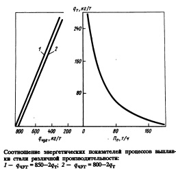 На основании температурных функций кон¬стант равновесия реакций образования СОа и HjO, а такпе баланса теплоты в зоне реакции определено, что температура горения, при которой минимизированы процессы диссоциации (2000—2200 °С), может быть достигнута, если усвоение теплоты будет составлять 60%. Од¬нако обеспечение такого теплообмена требует высокоразвитых поверхностей взаимодействия продуктов сгорания и нагреваемой среды. В условиях существующих технологий нагрев металла лимитируется теплопередачей на заключительном этапе плавки, когда пе¬репад температур между факелом и расплавом сокращается, а теплопоглощающие поверхности сужаются в результате падения скорости обезуглероживания. Исходя из условий' тепло-передачи от факела к ванне и фактических расходов топлива и чугуна для мартеновского процесса на твердой и жидкой завалках, а также в двухванных печах и конвертерах оп¬ределено (см.рисунок), что удельный расход топлива qT (кг условного топлива на 1 т) и производительность печи Пп связаны соотно- шением: qr = (a • S)/1260 • 1/Пр, где а- удельное теплопоглощение ванной, тыс. кДжДм2 • ч); 5- теплопоглощающая поверх¬ность, м2.