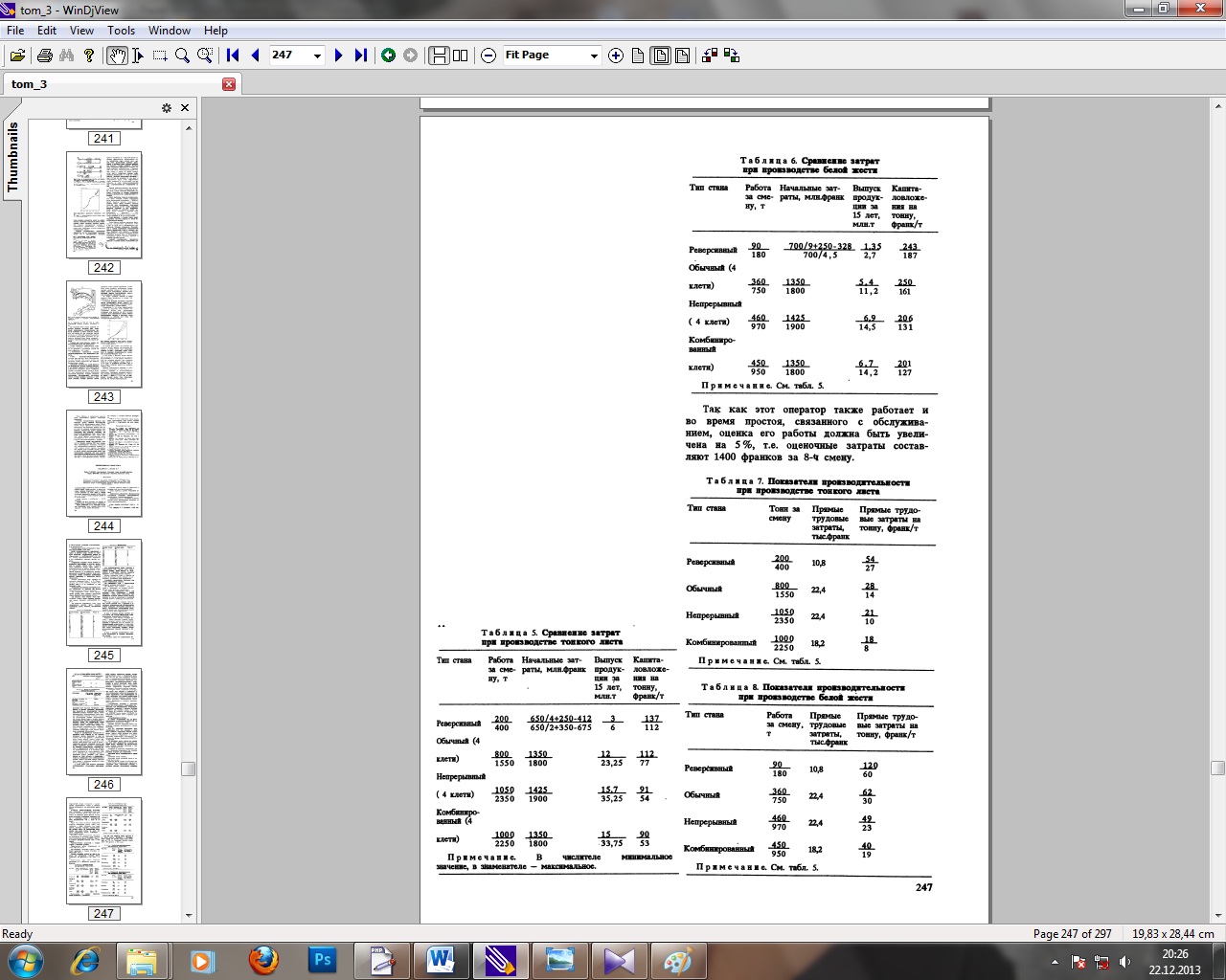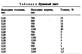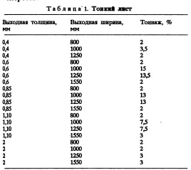 Станы тандемы в комбинации с линией травления: Соллак Сте Агат (SOLLAC Ste Agathe) во Франции (новая установка фирмы "Гринфилд");ИЛВА Новилигуре (ILVA Noviligure) в Италии (комбинация стана тандема после реконструкции с новой линией травления); СОЛЛАК Монтатэр (SOLLAC Montataire) во Франции (стан после реконструкции). Станы тандемы в режиме непрерывной работы: ЛЯ МАГОНА (LA MAGONA) в Италии (послере конструкции, улучшения разнотолщинности, плоскостности и производительности);КОКЕРИЛ Ферблатил (COCKERIL Ferblatil) в Бельгии (после реконструкций, повышения качества производительности). Расчет производительности, выраженный в тоннах за рабочую смену, основан на сортаменте продукции, специфических данных по оборудованию, т.е. комбинированный стан или нет, поэтому производительность выражается в т/ч, коэффициенте издержек, факторе скорости. Коэффициент издержек сильно зависит от надежности оборудования и качества продукции на. входной стороне стана. В расчете также учитывается частота смены валков и продолжительность их работы. Фактор скорости отражает возможность прокатывать с расчетной скоростью и достоверностью выполнения расчета. На фактор скорости также непосредственно влияют возможные неожиданные простои, приводящие к замедлению работы оборудования. Расчеты, приведенные ниже, основаны на сортаменте продукции (табл. 1 и 2). Предполагается, что степени обжатия, которые надо достичь, одни и те же независимо от типа прокатного стана. Основными существенными факторами, которые принимались во внимание при расчете производительности, являются следующие. Для реверсивного стана: масса протравленных рулонов, время заправки (извлечения) полосы, мощность, максимальная скорость. Для Ьбычного стана тандема: масса протравленных рулонов, время заправки (извлечения) полосы, мощность, максимальная скорость.