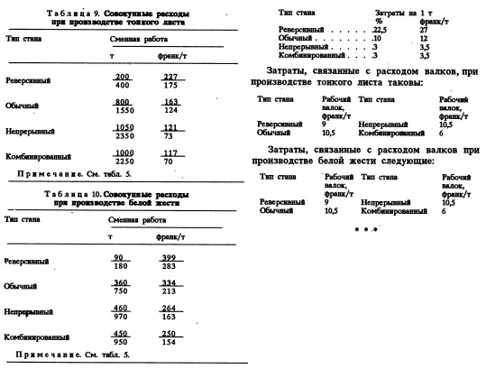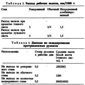 Для полностью непрерывного стана: масса протравленных рулонов, время заправки (извлечения) полосы, мощность, максимальная скорость. Для комбинированной линии травления с оборудованием стана тандема: масса горячекатаных рулонов, время простоя на входе, скорость в травильных емкостях, мощность прокатного стана, максимальная скорость. 4 Емкость накопителя полос и скорости на входных и выходных секциях выбирают в соответствии с указанными выше переменными. Основными ограничениями, типичными для каждой конфигурации, являются: для реверсивного стана — непрокатанная головная и концевая части полосы; для обычного стана тандема — зоны заправки и извлечения, на которые неблагоприятно влияет прокатка с натяжением; для полностью непрерывного стана и для прокатного стана, совмещенного с линией травления, — концы полос, прокатанных при пониженных скоростях, причем размеры полосы изменяют на ходу в соответствии с различной толщиной полосы и требуемым качеством материала. Благодаря операциям заправки (извлечения) полосы обычный стан в сравнении с реверсивным, непрерывным или комбинированным станами подвержен образованию продавов на валках. Следовательно, использование плакированных хромом или высокохромистых валков может оказатьея менее эффективным: В табл. 3 показаны средние значения расхода валков для каждой конфигурации станов, использующих эквивалентную технологию. Комбинация стана тандема холодной прокатки с линией травления устраняет необходимость складывать рулоны между операциями травления и прокатки. Что же касается некомбинированной конфигурации, то были предприняты значительные усилия для сокращения этого запаса посредством "обычного" метода программирования операций травления и прокатки. Одной из специфических особенностей реверсивного стана является то, что прокатка последнего прохода происходит с теми же валками, что и при пропуске в редукционной клети (тонкая полоса). Однако следует рассмотреть одну возможность: операцию очень быстрой смены валков при "полосе в клети" с совместным действием клапанной системы для лучшего управления смазкой и охлаждением, что приводит к существенному улучшению чистоты и шероховатости полосы, при условии, что производительность и ее возможное повышение управляются на основе принципа "обойма за обоймой". Изза операции заправки и извлечения полосы обычный стан тандем никогда не будет работать в комбинации с полностью непрерывным или комбинированным станами, процесс прокатки которых протекает более плавно, а продукция приобретает самые высокие характеристики. С точки зрения этих вопросов применение комбинированного оборудования представляет