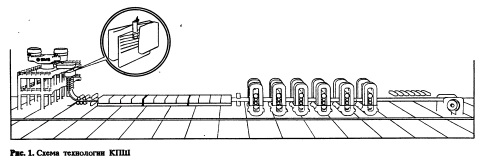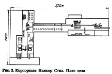 Рассмотрим технологию КПШ (рис. 1), выполняющую обширную программу, и усовершенствования обычной черновой и чистовой горячих штрипсов выпускает 50мм тонкую листовую заготовку, разрезаемую затем в соответствии с требующейся массой рулона. Например, при массе рулона 18 кг/мм требуется тонкий сляб длиной 47 м, который затем поступает с постоянной скоростью в печь с роликовым подом для выравнивания температуры. После выравнивания температуры тонкая листовая заготовка разгоняется до значительно более высокой скорости подачи в прокатный стан, пройдя перед этим через окалиноломатель. Первая установка КПШ в Ньюкор Стил была одноручьевой всего лишь с четырехклетьевым станом, рассчитанным на максимальную ширину Эти новые теэшологии, известные как высокотехнологичная прокатка, включает технически и экономически сбалансированные системы контроля и регулирования производства стали. Технология КПШ Первая установка для производства горячих штрипсов на основе технологии КПШ была введена в строй на заводе Ньюкор Стил в Кроуфорд свилле, США, в августе 1989 г. Установка КПШ состоит из машины непрерывного литья заготовок со специальным кристаллизатором и вертикальной направляющей ручья, которая штрипса 1350 мм. В мае 1992 г. выпуск продукции превысил 67000 т/мес. За прошедший период на указанной установке было произведено >2 млн.т горячих штрипсов для дальнейшего передела. Отличные технические и экономические результаты побудили Ньюкор Стил принять решение о создании второй установки КПШ в Хикмане (шт.Арканзас, США, рис. 2). Монтаж ус таноки занял всего лишь 15 месяцев, после чего в августе 1992 г. установка успешно начала выпускать продукцию. С самого начала была предусмотрена возможность для расширения установки до двухручьевой. Технология производствва осталась такой же, как и на установке в Кроуфордсвилле, с учетом увеличения размера и изменения некоторых деталей конструкции. Максимальная ширина штрипсов увеличилась до 1560 мм.