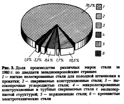 Благодаря используемой технологии чистовой прокатки, разработанной на основе последних достижений в этой области, так называемой высокотехнологичной прокатке, стало возможным значительно уменьшить допустимые отклонения на толщину и профиль штрипсов. Что касается механических свойств производимой продукции, то, основываясь на полученных результатах, можно сделать вывод, что качество горячих штрипсов, полученных на установке КПШ, выше, чем качество штрипсов, полученных обычным способом. Характерной особенностью является постоянство по длине таких механических характеристик, как предел текучести, относительного удлинения при растяжении, что несомненно объясняется полным выравниванием температуры в печи с роликовым подом и постоянной скоростью прокатки. Применение окалиноломателя нового типа позволило заметно улучшить качество поверхности. Эта система включает сопла, установленные на расположенных рядом друг с другом вращающихся головках, и позволяет значительно повысить давление, расходуя при этом меньше воды. Философия Ньюкор Стил заключается в том, что она концентрируется на одной категории из длинного списка видов листрвого проката. На рис. 3 показано распределение производства горячих штрипсов в двадцати западноевропейских странах по маркам стали. Подобная картина, однако, характерна и для США, и других регионов. В этой связи знаменательна подавляющая доля в 76 % мягких нелегированных сталей, предназначенных для холодной прокатки и холодной штамповки. После соответствующей адаптации технологии, штрипсы из этих марок сталей могут производится на установках КПШ. Однако для того чтобы можно было полностью оценить потенциал линий КПШ, следует учесть разброс продукции по конечным размерам, как по ширине, так и по толщине. Около 68 %, т.е. 2/3 общего выпуска продукции в настоящее время можно производить на линиях КПШ, уменьшая число задействованных клетей.