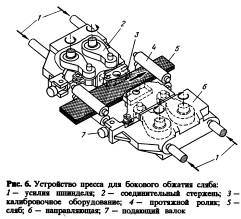 Установка КПШ Производительность одноручьевой машины непрерывного литья заготовок составляет ^1 млн.т в год при ширине продукта 1600 мм. Однако производительность прокатного стана КПШ гораздо выше. Поэтому увеличение количества выпускаемой продукции может быть достигнуто за счет установки нескольких одноручьевых линий, ведущих к стану (рис. 4). В этом случае транспортировка тонких листовых заготовок в приемную зону прокатного стана лучше всего может быть реализована с помощью транспортера горячих заготовок или Линия черновых клетей Экономические факторы одновременно требуют снижения количества типоразмеров слябов и увеличения производительности машины непрерывного литья заготовок путем отливки как можно более широких слябов. Поэтому от линии черновых клетей требуется возможность приспособления к различной ширине сляба и увеличение бокового обжатия. Обжатие по ширине в обычных клетях с вертикальными валками ограничено, так как угол захвата не может превысить определенную величину. Кроме того, существует ограничение на максимально возможную степень обжатия изза возможности непрерывного кон цеобразования и бульб на краях слябов. Эту проблему разрешает пресс для бокового обжатия слябов (рис. 6). При установке в линии прокатки горячих штрипсов он дает следующие преимущества: количество типоразмеров слябов, выпускаемых машиной непрерывной разливки стали, может быть сведено к нескольким стандартным ширинам; деформирование при обжатии на данном прессе протекает более благоприятно, чем в обычных клетях с вертикальными валками, т.е. течение металла к центру происходит лучшим образом. Меньше вероятность образования бульб на краях сляба. Все это свидетельствует о том, что данный способ обжатия более эффективен после прохода через валки с гладкой бочкой; уменьшение площади поперечного сечения на концах слябов заметно ниже. Это ведет к уменьшению расхода металла на обрезку концов и таким образом к увеличению выхода годного: значительно улучшено качество кромок, что является предпосылкой к снижению отклонений от заданной ширины при дальнейших проходах через черновые клети. За счет снижения образования бульб растет выход годного. Поведение слябов при обжатии по ширине на вертикальных валках хорошо иссследовано. Подробно изучено формирование профиля "концов" и образование бульб на кромках при подобном обжатии. Первый пресс подобного типа был пущен в действие в конце 1991 г. в Дуйсбург Бекерверте (Германия) на заводе фирмы Тис сен Сталь АГ. В мае 1992 г. пресс перешел на круглосуточный режим работы. Четырехвалковая реверсивная клеть, оснащенная эджером с вертикальными валками