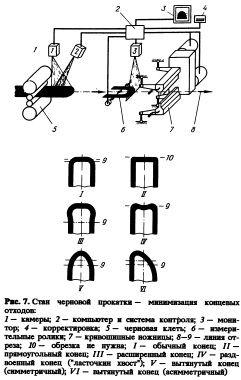 Эджер с вертикальными валками, установленный в четырехвалковой реверсивной клети, снабжен системой с гидравлическим прижимным механизмом, позволяющим избежать обратного выталкивания и осуществлять дальнейшие небольшие боковые обжатия в черновых клетях. Высокая чувствительность и скорость реагирования этой регулирующей гидравлической системы позволяют изменять межвалковый зазор эджера во время прохода сляба. Регулируя степень бокового обжатия, можно так откорректировать ширину концевых клетей сляба, что после дальнейшей прокатки удается получить практически прямоугольный сляб, избегая образования "рыбьих хвостов". С помощью датчиков ширины и гидравлического прижимного механизма, используемого для регулирования и контроля ширины сляба становится возможным обеспечить соответствие полученных размеров по ширине требуемым с высокой степенью точности. Минимизация потерь на концевые отходы Несмотря на контроль ширины в линии черновых клетей и корректировку концевых частей сляба, обрезка концевых частей штрипса перед подачей его в чистовую клеть все же необходима. Для этого используются кривошипные ножницы. Соединительный стержневой механизм таких ножниц обеспечивает практически вертикальное направление движения ножей навстречу друг другу. Геометрия соединительного стержня и радиус кривошипа подбираются к толщине штрипса таким образом, что удается достичь низкой скорости ножа относительно штрипса. В результате улучшается концевых частей и контроль ширины на этапе черновой прокатки. На рис. 7 показана обрезка передних концов слябов. Суть системы минимизации концевых отходов заключается в точном измерении концевых частей сляба с помощью специальных датчиков с дальнейшей обрезкой точно в том месте, где размер начинает выходить за пределы допуска по ширине. ' На практике такая система позволяет увеличить экономию на концевых отходах на 40 %. Чистовая прокатка горячих штрипсов Высокотехнологичная прокатка горячих штрипсов на линии чистовых клетей характеризуется комплексным использованием систем регулировки и контроля с целью получения конечной продукции высокого качества с заданной толщиной, профилем и планшетностью.