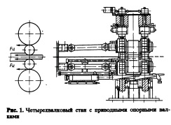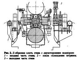 Для экономичной прокатки штрипса небольшой толщины с большими обжатиями следует применять рабочие валки малого диаметра. Поэтому при проектировании станов холодной прокатки обращают внимание на возможность уменьшения диаметров рабочих валков. Для прокатных станов с приводными рабочими валками минимально возможный диаметр рабочего валка определяется требованиями компоновки привода. Применение рабочих валков мецынего диаметра возможно, если приводным является опорный валок или в случае шестивалкового стана промежуточный валок (рис. 1). Когда применяют такой привод, горизонтальные силы вызывают изгиб рабочего валка ш сторону, противоположную направлению движения полосы; эта тенденция растет с уменьшением диаметра валка. С таким приводом уменьшение диаметра рабочего валка возможно лишь в ограниченных пределах. Для уменьшения влияния изгиба рабочих валков применяют так называемый метод горизонтальной стабилизации, чтобы сдвинуть оба рабочих валка в направлении движения полосы. Величина сдвига зависит от усилия на валке, момента прокатки и от натяжения полосы на входе и выходе. Величину сдвига выбирают таким образом, чтобы скомпоновать горизонтальные составляющие усилия прокатки и поверхностные силы, действующие на валок. Диаметр рабочего валка можно еще больше уменьшить, применяя боковой подпор валка по всей его длине (рис. 2). Для этого разработано несколько вариантов опорных валков, включая систему подпора с одной и с. двух сторон. На рис. 2 в качестве примера опорных валков для подпора рабочего валка с двух сторон показана Zобразная клеть стана САНДВИГЗендцимир. Система опорных валков Zобразная клеть стана может работать и как четырех и как шестивалковый станы.