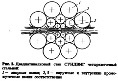 Клеть стана расположена на входной секции линии отжига и травления для прокатки штрипса с большими обжатиями и прокатывает неотожженный пггрипс из нержавеющей стали с обжатием до 35%. Клеть стана оснащена современными системами контроля размеров и планшетности, что делает возможным на одной единственной линии выпускать пользующийся спросом готовый материал. На рис. 3 покзано расположение валков двадцативалковой клети. Четыре ряда опорных подшипников (2 по 4) подпирают узел валков по всей длине бочки. Число опорных подшипников и поддерживающих подушек, использованных при этой компоновке клети стана, определяет ширину клети. Предельные размеры по ширине ограничены величиной крутящего момента на приводные наружные промежуточные валки.