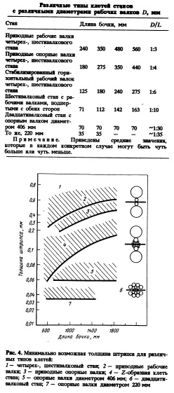 Клеть стана (см. рис. 3) можно пропорционально уменьшить или увеличить, исходя из диаметра опорных подшипников чдц от диаметра рабочих валков. Диаметры рабочих валков, которые можно применить для описанного типа клети стана, приведены в таблице. Для четырех и шестивалковых станов диаметр валков независимо от типа клети стана увеличивается почти прямо пропорционально длине бочки, так что для этих величин справедливо практически постоянное соотношение. Для многовалкового стана зависимость другая: диаметр рабочих валков зависит от диаметра опорных подшипников и остается неизменным для любой длины бочки. Различный диаметр рабочих валков для разных типов клетей в зависимости от минимальной толщины прокатываемого штрипса показан на рис. 4. Из данных рис. 4 ясно, что толщину штрипса, который может быть прокатан в четырех и шестивалковых клетях, можно существенно уменьшить путем двустороннего подпора (Zобразная клеть стана рабочих валков). Однако становится также очевидным, что особотонкий и широкий штрипс можно прокатать только на двадцативалковом стане. Именно поэтому для прокатки штрипса небольшой толщины с высоким сопротивлением деформации применяют почти только двадцативалковый стан. Однако и двадцативалковые станы имеют ограниченные возможности прокатки, особенно фольг с высоким сопротивлением деформации, таких как фольга нержавеющей стали. В настоящее время этот предел можно сместить в сторону штрипсов меньшей толщины за счет применения рабочих валков с бблыпим модулем упругости. Применение валков из высокопрочного металла с модулем упругости в 3 раза бблыпим, чем другие материалы, позволяет значительно уменьшить смятие рабочих валков и вместе с этим снизить давление на валки и минимальную толщину прокатываемой полосы. Производительность Производительность станов холодной прокатки зависит не только от параметров оборудования, таких как усилие на валках, крутящий момент и мощность привода, но и от средств регулировки формы зева валков, высушивания и охлаждения штрипса. Важно также оборудование, влияющее на простои стана (например, устройство для замены валков). Для увеличения производительности прокатных станов были разработаны новые системы для управления названными параметрами. Устройство изменения формы зева валков по форме штрипсов Для процесса холодной прокатки форма зева валков под нагрузкой должна точно соответствовать форме штрипсов, входящего в клеть стана. Изменить форму зева валков по форме штрипса чрезвычайно трудно для широкополосных станов, так как значительно увеличиваются деформации валков. При прокатке штрипса небольшой толщины регулировка формы зева валков должна быть очень точной, поскольку даже небольшие отклонения могут привести к значительному изменению удлинений по отдельным участкам штрипса, к большей разнице наклепа по ширине полосы и к ее обрыву. Фирма разработала много исполнительных механизмов для регулирования формы зева валков особенно для широкополосных станов. На рис. 5 показан исполнительный механизм современного двадцативалкового стана СУНДВИКе с четырехстоечной конструкцией станины. При четырехстоечной конструкции наклон оси валков получают воздействием нажимных винтов со стороны оператора и со стороны привода, как на четырехвалковом стане. Перемещен