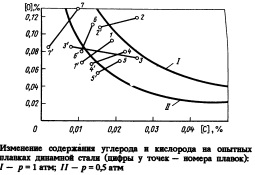 При более высоких содержаниях углерода вероятность реакции (1) еще выше. Как видно из уравнения (1), реакция сопровождается удвоением объема газа, что позволяет резко усилить перемешивание ванны по сравнению с азотной продувкой при том же расходе вдуваемого газа. Это должно обеспечить дополнительное уменьшение переокисленности металла, увеличение выхода годного, снижение расхода раскислителей. Из выражения (1) видно также, что реакция протекает с поглощением тепла — это должно уменьшить износ околофурменной зоны футеровки днища. Важным результатом частичной замены азота на углекислый газ должно быть также уменьшение со Изменение содержания углерода и кислорода на опытных планках динамной стали (цифры у точек — номера плавок): I — р \ атм; II — р0,5атм держания азота в стали. В результате для большинства плавок отпадает необходимость в аргонной продувке. При выплавке высококачественных сталей для дополнительного снижения содержания азота в металле, а также для уменьшения вторичного окисления (как при сварке) целесообразна защита углекислым газом струи металла на выпуске.