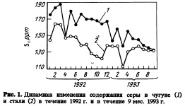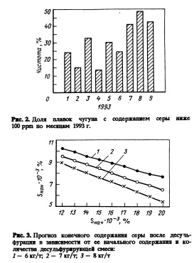 На рис.2 приведена доля плавок чугуна с содержанием серы ниже 100 ppm в течение 1993. г. Как видно, достигнутые величины колеблются и в том случае, если в определенные месяцы производилось большее число плавок с требованиями по низкому и очень низкому содержанию серы (<100 и 50 ppm), то производилась десульфурация чугуна вдуванием смеси на основе извести в заливочном ковше. Прогнозируемые значения конечного содержания серы в чугуне после десульфурации при различных расходах десульфурирующих смесей указаны на рис.З.