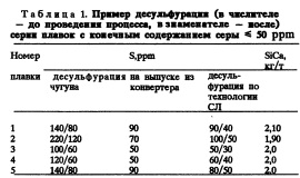 На стенде, где обеспечивается глубокая десульфурация порошкообразными материалами по технологии CJI, проводится продувка порошкообразным силикокальцием. В табл.1 показано изменение содержания серы в металле при проведении серии плавок с максимальным конечным содержанием серы в стали 50 ppm. Достижение низкого содержания фосфора в стали ![]()