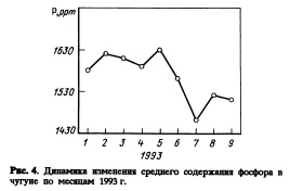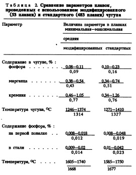 Для достижения низкого содержания фосфора в призводимой стали используют следующие методы: для производства стали с максимальным содержанием фосфора 0,02% применяют 34 чугун с содержанием фосфора < 0,01%; для призводства стали с максимальным содержанием фосфора 0,015 % необходимо использовать чугун с содержанием фосфора < 0,01 % и иметь в конвертере шлак с основностью > 3,2. ся между 0,14 и 0,16%. Это довольно высокие значения для конвертерного процесса. На уровень содержания фосфора в чугуне в большой мере влияет конвертерный шлак, вводимый в шихту доменной печи. Для выяснения этой проблемы прежде всего были статистически обработаны данные большого числа (п = 682) конвертерных плавок. Результаты обработки показали, что более низкое содержание фоснизком содержании марганца в первой пробе (более низком содержании марганца в чугуне); более низкой температуре на первой повалке; более высокой основности конечного шлака; более высокого содержания железа в конечном шлаке. Для подтверждения этих положений была проведена обработка серии плавок с содержанием в чугуне фосфора < 0,1% и уменьшенным содержанием марганца. Плавки были сопоставлены с плавками, проведенными с использованием чугуна обычного химического состава (табл.2.) Была подтверждена необходимость уточнения химического состава чугуна и модифицирования шлакового режима в конвертере.