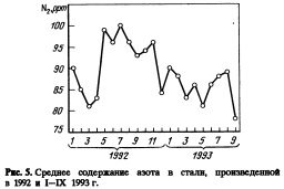 Оптимизация содержания азота в стали Несмотря на тот факт, что в настоящее время наблюдалось слабое постепенное уменьшение среднего содержания азота (рис.5), среди проведенных плавок имелись и такие,по содержанию азота 0,010 % в которых превышен. Это относится прежде всего к плавкам, обработанным для получения низкого содержания серы, на которых в процессе продувки содержание азота в стали увеличивалось более 0,01%. В этом случае используют следующую технологию: максимальная десульфурация чугуна достигается на первой стадии при продувке десульфурирующим порошком в струе аргона; плавка в конвертере ведется с присадкой руды в количестве ~ 6 кг на 1 т для интенсификации процесса обезуглероживания; раскисление проводится таким образом, чтобы максимальное содержание кремния в стали составляло 0,10 % (в спокойных сталях это относится и к кремнию и к алюминию), а максимальное содержание алюминия 0,005 %; плавки подвергаются вакуумированию с продувкой аргоном и легируются после дегазирования. Результаты использования этой методики — уменьшение содержания (в числителе— минимальное, в знаменателе — максимальное) азота по сравнению со стандартной технологией иллюстрируют следующие данные, ppm: