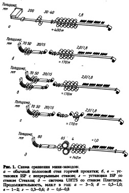 СТАНКИ ДЛЯ ПРОКAТКИ ТОНКИХ СЛЯБОВСоздание объединенных технологических линий литья и прокатки тонких слябов в настоящее время очень перспективно с точки зрения капиталовложений. Изготовители оборудования должны подчиняться концепции "цеха и оборудования по специальному заказуГ, чтобы поставлять пользователю оптимальное во всех отношениях (по качеству требуемого конечного продукта и по стоимости) оборудование, удовлетворяющее требованиям рынка. Рассмотрены широкий диапазон областей применения, преимущества и недостатки отдельных типов технологических линий.Введение Назначение технологической линии тонких слябов — изготовление конечного продукта, способного конкурировать с продукцией металлургического комбината. Основное преимущество тонколистовой заготовки — возможность экономически эффективного производства мелких партий. В то время как широкополосный прокатный стан мр таллуррюеского комбината предназначен для выпуска от 3 до* 5 млн.т проката, в1 год, линия литья и прокатки тонких слябов может быть использована для производства от 0,4 до 2,0 млн.т в год (рис. 1, а). Области применения Линия литья и прокатки тонких слябов обладает высокой гибкостью с точки зрения производственной мощности и позволяет получать продукцию, которая не может быть изготовлена на обычном полосовом стане горячей прокатки. Такие линии находят в настоящее время широкое применение. Линия тонких слябов используется для выпуска продукции на ограниченный региональный рынок, который до этого должен был импортировать горячекатаную полосу. Она предназначена для ограниченной по размерам и маркам стали номенклатуры, что позволяет создать наилучшие условия при изготовлении каждого вида продукции. Линия тонких слябов позволяет также получить листовые заготовки таких размеров и из таких марок стали, которые до этого или производились на обычных прокатных станах с большим трудом, или не производились вообще.