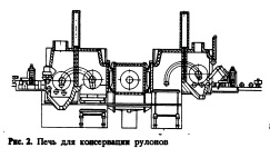 Во всем мире основным препятствием для сооружения таких линий являются огромные капиталовложения в металлургические комбинаты. Приспособленная к экономическим требованиям пользователя и к действительным требованиям рынка линия тонких слябов позволяет ступенчато увеличить производственную мощность (рис. 1, в). Для различных областей применения линий тонких слябов требуются различные концепции проектирования расположения оборудования и самого оборудования. Система передачи листовых заготовок свя~ зывает линию литья с прокатным станом. Такая система не нужна при использовании стана Платцера, предназначенного для работы в непрерывной технологической линии. Во всех остальных случаях требуется промежуточное оборудование, компенсирующее различие скоростей процессов литья и прокатки. Обнаружено, что эффективность процесса повышается при нагреве листовой заготовки в индукционном нагревателе до требуемой температуры прокатки и последующем ее сматывании вместо применения прямой заготовки. Преимущества индукционного нагрева: меньшая длина по сравнению/ с печью с роликовым подом; меньшие тепловые потери; меньшее количество водоохлаждаемых роликов; меньший износ роликов; меньше окалины, отсутствие окислительной атмосферы; селективная подача энергии регулируемыми индукторами; потребление энергии , только при прохождении заготовки; увеличенная подача энергии к ребрам сляба. Преимущества передачи смотанной заготовки: листовая заготовка в смотанном виде компактна; уменьшаются тепловые потери за счет меньшей площади поверхности; компактность облегчает транспортировку; транспортировка рулона в небольшом изолирующем кожухе в отличие от транспортировки вытянутой заготовки, при которой должна перемещаться большая печь; керамические опоры вместо водоохлаждаемых роликов; меньшее количество окалины, так как только последний виток нагревается в окислительной атмосфере; простота складирования заготовок. Полная длина установки ISP ~180 м. На линии литья тонких слябов, которая была установлена на заводе ARVEDI (Италия), сразу же после затвердевания непрерывная заготовка подвергается обжатию в трех обжимных к^4тях до толщины 15—20 мм. После этого от непрерывной заготовки отрезается затравка, а сама заготовка разрезается на мерные длины в соответствии с требуемой массой рулона. Затем тонколистовую заготовку нагревают в индукционном нагревателе до требуемой температуры прокатки и сматывают в рулоны на моталке Cremona. Коробка Cremona состоит из двух наложенных моталок, помещенных в газовую печь. В то время как одна моталка сматывает поступающую листовую заготовку, вторая разматывает предыдущую заготовку со скоростью, соответствующей скорости прокатки. Печь для намотки представляет систему, имеющую разнообразное применение. После прохождения через секцию индукционного нагрева листовая заготовка сматывается в рулон без оправки в закрытом пространстве печи в соответствии со схемой работы коробки Cremona и затем подает€Я на подовую тележку. Тележка проходит через промежуточную зону и подает смотанную в рулон заготовку к разматывателю. Здесь рулон разматывается на донных роликах разматывателя. Открывающиеся поочередно дверцы печи образуют шлюзовую систему, сохраняющую в печи теплоту. Промежуточная зона состоит из передвижной