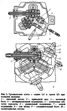 Трехвалковые клети устанавливают на опорных тележках или в кассетах. Прокатка без скручивания осуществляется за счет расположения прокатных клетей под углом 180° относительно друг друга. Расположенные таким образом трехвалковые клети образуют блок. Трехвалковые блоки главным образом используются в промежуточных и чистовых клетях (начиная с заготовки; диаметром от 75 .до 80 мм), а также специально для прецизионной калибровки. Компактный стан требует существенно меньших производственных площадей с простым недорогим фундаментом. Кроме того, значительно снижаются расходы на электропривод и системы управления при трехвалковой прокатке за счет системы группового привода. Конструкция основания клети тележечного типа позволяет легко заменить всю деформирующую группу стана. За 3—5 мин можно сменить тележку у 10 клетей. Другая возможность— это смена кассеты клети с помощью крана. Одним из основных принципов прокатки в трехвалковых клетях является полная передача работ по подготовке и регулировке направляющих и клети с линии стана в цех для подготовки валков. Это означает, что при возвращении клетей на линию стана можно сразу же начинать прокатку без пропуска пробной заготовки, регулировки или перерегулировки валков или направляющих. Переточка валков клетей с одним приводным валом осуществляется на токарном станке с ЧПУ типа CNC, одновременно всех трех валков, остающихся в клети. Сменд валков необходима только после их полного износа, т.е. при невозможности их переточки. Валки трехвалковых клетей с тремя приводными валками перетачиваются индивидуально на стандартах токарных или шлифовальных станках.