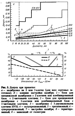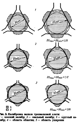 Конструкция калибров и эффективность деформации. Три типа калибров (рис. 2) применяются для обжатия заготовок до 28% по сечению. Самый простой калибр— плоский, используемый для основного обжатия, а также для прокатки и калибровки по размеру шестигранных заготовок. Для того чтобы не было заката, используют только часть теоретически возможной вытяжки. Кроме того, калибр можно 250 регулировать в широком интервале (до 25% от его диаметра), что улучшает использование валка, уменьшает количество нарезаемых калибров и смен валков. Овальные калибры испольуют при переходе к круглому калибру. Для этой цели рабочие поверхности калибра делаются вогнутыми, а величина углов профиля увеличивается. Закаты исключаются. Интервал регулировки калибра— до 12% от его диаметра. Круглые калибры используют вслед за овальными калибрами, а также в калибровочных станах для получения заготовок, с круглым сечением. Относительно большое раскрытие калибров предотвращает закаты и позволяет регулировать размеры калибра в пределах до 6% от его диаметра. Подготовка валков проста, потому что в большинстве клетей используют только плоские калибры. Другим преимуществом является использование одной и той же конструкции валка для всех типоразмеров заготовки и всех марок прокатываемого металла. В результате сокращается до минимального запас валков и направляющих, уменьшается частота регулировок, упрощается работа стана, поскольку для управления станом требуется меньше персонала с невысокой квалификацией.?
