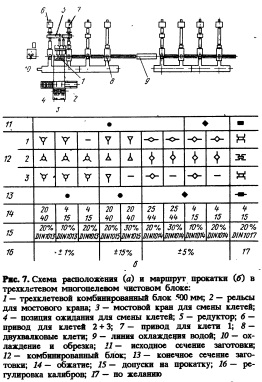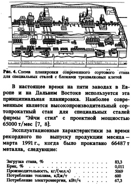 Применение технологии прокатки в трехвалковой клети Традиционная планировка сортопрокатного стана с трехвалковыми блоками. Планировка сортопрокатного стана с трехвалковыми блоками в промежуточной, предчистовой и калибровочной зонах цеха для прокатки специальных сталей показана на рис. 4. Здесь же показано оборудование для быстрой замены и цех подготовки валков. В настоящее время на пяти заводах в Европе и на Дальнем Востоке используется эта принципиальная планировка. Наиболее современным является высокопроизводительный сортопрокатный стан для специальных сталей фирмы "Эйчи стил" с проектной мощностью 65000 т/мес [7, 8].