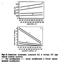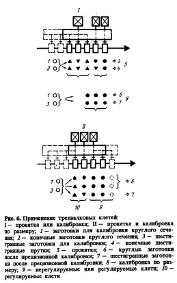 За этот период сортамент прокатанных прутков изменялся , от 16 до 100 мм в диаметре; обрабатывалось прутков окоАо 450 размеров в месяц и большое количество марок сталей. Прокатные блоки. Прокатные блоки используют вместо промежуточных и предчистовых станов. В зависимости от требуемой степени обжатия блок содержит до 10 клетей. Обжимные клети с плоскими калибрами имеют групповой привод от одного двигателя. Эти клети обычно нерегулируемые. Последние две клети отличаются наличием системы регулирования валков и имеют индивидуальный привод для прокатки заготовок различных круглых и шестигранных сечений, которые будут подвергнуты дальнейшему обжатию (прокатке или калибровке) в линии стана. Блоки прецизионной калибровки по размерам (БПК). БЛОК прецизионной калибровки по размерам Состоит из трех клетей, которые имеют привод от одного двигателя. Заготовки для шестигранного или круглого проката подвергаются чистовой прокатке в таких блоках с допусками от 1/4 по ASTM и 10% по DIN (100% выпускаемой продукции) без прокатки пробной заготовки или дополнительной регулировки. Из заготовки одного размера можно получить прокаткой целую серию готовых прутков различных размеров, что упрощает работу дальнейших клетей стана. Если допуски на готовую продукцию не очень жесткие, можно также использовать двухклетьевой блок для точной калибровки (см. рис. 5, а).