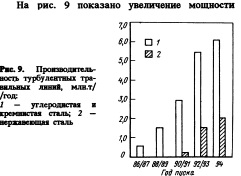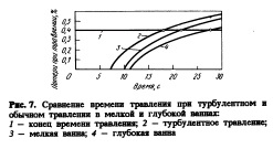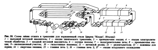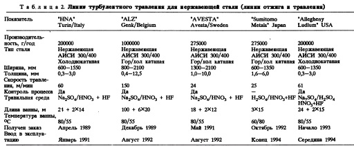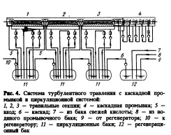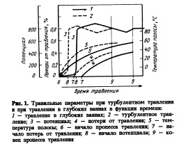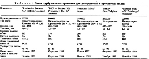 Турбулентная линия травления имеет существенное преимущество при травлении углеродистой и нержавеющей стали по сравнению с другими способами. Время травления существенно сокращается по сравнению с травлением в глубоких или мелких ваннах обычных линий (рис. 7). В результате длина линии сокращается примерно на 20 %, что соответственно снижает ее Процесс турбулентного травления углеродистой стали может иметь производительность до 2,6млн.т/год в зависимости от сортамента. Примером такой высокопроизводительной линии может служить линия, установленная на заводе Сидмар (Бельгия) в составе пятиклетевого стана бесконечной прокатки производительностью 2,0—2,5 млн.т/год. Скорость травления достигает ЗбОм/мин.
