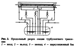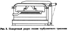 При большой кинетической энергии кислоты при турбулентном травлении ее проникновение в трещины в окалине происходит ускоренно. Поэтому начало травления происходит быстрее, чем в других процессах (рис. 1). Этот рисунок показывает параметры травления углеродистой стали как соляной, так и серной кислотой, а также травление нержавеющей стали смесью азотной и фтористой кислоты. Высокая кинетическая энергия подаваемой на травление кислоты имеет и другие преимущества: оптимальное соотношение подаваемой кислоты и стравливаемой окалины; оптималь ную теплопередачу от кислоты к полосе; удаление нейтральных к травлению частиц окалины г поверхности полосы. Ячейка турбулентного травления и конструкция системы Турбулентное течение в каждой секции травления обеспечивается соплами, расположенными на входе и на выходе полосы в секции (рис. 2). Давление, создаваемое турбулентным течением, является в то же время динамической пробкой для кислоты в секции травления. Кинетическая энергия кислоты, создаваемая насосами, после прохождения через нагревательную систему и сопла создает турбулентное течение и подпор в каждой секции травления. Каждая секция турбулентного травления (рис. 3) состоит из канала толщиной 150 мм, который полностью заполнен кислотой. Канал полностью закрыт, что сводит испарение кислоты к минимуму. На нижней поверхности канала расположены блоки, по которым скользит полоса и которые расположены таким образом, что они создают турбулентное движение с нижней поверхности полосы. Сток кислоты организован в центре секции через дренажные каналы (рис. 2 и 3). Кислота через осушительную камеру попадает в бак приемник. Объединение секций в систему турбулентного травления показано на рис. 4.