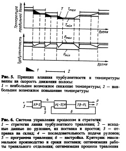 Время травления определяется временем нахождения полосы в травильном растворе до полного удаления окалины. Это время зависит от параметров травления, которые могут быть разделены на две категории: а) параметры, характеризующие материал, т.е. количество легирующих элементов в стали, толщину полосы, температуру смотки рулона, скорость охлаждения рулона; б) параметры, характеризующие процесс, т.е. тип травильного раствора, температуру травильной ванны, концентрацию кислоты в растворе, содержание металла в травильном растворе, движение раствора (кинетическую энергию), предварительное травление. Параметры, характеризующие материал, обычно задаются производителями металла, а параметры процесса определяются поставщиком линии травления. С учетом травильных параметров вся травильная линия рассчитана на максимальную скорость движения полосы. Это означает, что не будет допущен перетрав при любой скорости. Перетрав влечет за собой экономические последствия, так как повышенное содержание железа в кислоте затрудняет ее регенерацию. При турбулентном травлении травильный эффект наблюдается при любой скорости движения полосы с минимальной возможностью пе ретрава. Это обеспечивается контролем турбулентного движения и температурой раствора. В этом процессе при максимальной скорости полосы требуется максимальная турбулентность и температура. Эти величины регулируются системой автоматического контроля в зависимости от способности каждой полосы к травлению. Система управления травлением разрабатывалась в тесном сотрудничестве с ведущими сталеплавильными фирмами Западной Европы. Направления этих разработок удовлетворяли следующим условиям: 1) полоса не должна быть недотравлена; 2) перетрав должен быть минимальным; 3) температура кислоты должна быть минимальна, чтобы снизить затраты энергии. Время травления может быть сокращено за счет повышения температуры кислоты и за счет повышения турбулентности потока. Оба этих параметра должны изменяться в определенных пределах, но турбулентность потока может изменяться быстрее, чем температура раствора (рис. 5). Полная интегрированная система контроля состоит из трех модулей (рис. 6). ![]()