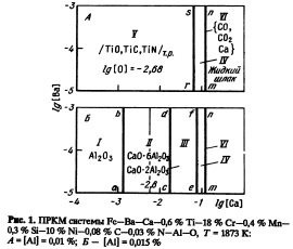 ТЕРМОДИНАМИЧЕСКИЙ АНАЛИЗ ПРОЦЕССОВ РАСКИСЛЕНИЯ КОРРОЗИОННОСТОЙКОЙ СТАЛИ Х18Н10Т КАЛЬЦИЕМ И БАРИЕМПроведен термодинамический анализ процессов, протекающих при раскислении коррозионностойкой стали типа Х18Н10Т кальцием и барием. Рассчитаны поверхности растворимости компонентов в жидкой стали,, а также диаграммы расхода лигатуры. Обсуждены проблемы защиты поверхности кристаллизующегося слитка легкоплавким шлаком, образующимся при введении лигатур во время разливки.При разливке высокохромистых сталей и сплавов тугоплавкие оксиды хрома и хромшпинели ды, оксинитриды титана и выделения корунда способны образовать тугоплавкие корочки, которые создают подвороты. Если бы существовал между изложницей и металлом жидкоподвижный шлаковый слой, то он не дал бы возможности закрепиться этим корочкам, а следовательно, появилась бы возможность борьбы с подворотами в слитках. Самый простой способ образовать шлаковую прослойку между изложницей и поверхностью слитка — это вызвать образование в основном жидкоподвижных неметаллических включений при раскислении стали, поэтому необходимо решить вопрос в принципе, возможно ли образование этих включений при раскислении, в частности при раскислении коррозионностойкой стали, какое количество шлаковой фазы может образоваться и какой состав эта фаза имеет. При решении этой проблемы необходимо установить концентрационные пределы составов металла, равновесного с жидкоподвижной шлаковой фазой эндогенного происхождения. Для этой цели нужно построить поверхность растворимости компонентов в стали (ПРКМ) по имеющимся термодинамическим данным. С термодинамической точки зрения коррозионностойкую сталь типа 08Х18Н10Т, содержащую барий и кальций, можно рассматривать как двенадцатикомпонентную систему Fe — Ва— Са — Ti — Сг — Al — Mn — Si — О — С— N —Ni. Анализ фазовых равновесий в данной системе показал, что в равновесии с жидким металлом, в зависимости от содержания алюми ния, азота, кальция и бария, могут находиться следующие неметаллические фазы: ок сикарбонитридный (ОКН) раствор титана (TiO, TiC, TiN), алюминаты кальция (СаО * 2А1203, СаС) • бА^Оз), корунд (А12ОЗ), оксидный расплав (FeO, ВаО, СаО, Ti02, Сг203, А12Оз, MnO, Si02) переменного состава. Также возможно появление газообразных продуктов (СО, С02 и Са). С использованием методики, разработанной авторами [1,2], рассчитаны поверхности растворимости компонентов в жидком металле данной системы. Результаты расчетов представлены на рис.1. Область I соответствует равновесию жидкого металла с корундом.