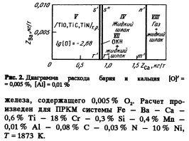 В областях II и П1 заданы составы жидкого металла, находящегося в равновесии с гекса и биалюминатами кальция соответственно, в области IV с оксидным расплавом, в области V — с ОКН и в области VI — составы жидкого металла, равновесного с газовой фазой, содержащей СО, С02 и Са. Контрастными линиями обозначены составы жидкого металла, находящегося в равновесии одновременно с двумя оксидными фазами. На линии аЪ нанесены составы жидкого металла, равновесного с А12Оэ И СаО • 6А12Оэ, на линии cd — с 10 СаО • 6А12Оэ И СаО • 2А1203. На линии rs нанесены составы жидкого металла и ОКН раствора, равновесного с оксидным расплавом. На линии ef нанесены составы жидкого металла и оксидного расплава, равновесного с Са0*2А1203, на линии тп — с газовой фазой (СО, С02, Са). Тонкими линиями показаны сечения поверхности растворимости плоскостями постоянной концентрации кислорода в металле. Термодинамический анализ раскислительной способности элементов в железе позволяет произвести расчеты их расхода на операции раскисления и легирования расплава. Применительно к системе Fe — Ва — Са — Ti — Сг —Al Mn SiOCNNi расход элементов на раскисление и легирование можно определить с использованием балансовых уравнений [1]. При этом необходимо задаваться составом исходного металла и составами равновесных фаз. Последнее устанавли вается при расчетах ПРКМ систем. На рис.2 представлены результаты, расчета расхода бария и кальция на раскисление 1 т железа, содержащего 0,005 % 02. Расчет произведен для ПРКМ системы FeBaCa 0,6% Ti 18% Сг 0,3% Si 0,4% Mn 0,01% Al 0,08% С 0,03% N 10% Ni, Г = 1873 К.