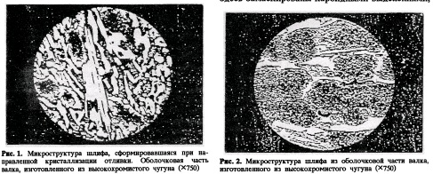 ПРИМЕНЕНИЕ ОПОРНЫХ И РАБОЧИХ ВАЛКОВ ИЗ ЧУГУНА С ВЫСОКИМ СОДЕРЖАНИЕМ ХРОМА В ДРЕССИРОВОЧНЫХ СТАНАХ И СТАНАХ ТАНДЕМ ХОЛОДНОЙ ПРОКАТКИБелые литейные чугуны с высоким содержанием хрома уже много лет применяют для изготовления элементов конструкций горного и топливоперерабатывающего оборудования, подвергающихся абразивному износу. В середине 60х гг. производители валков для чистовых клетей станов горячей чистовой прокатки впервые проявили интерес к этому материалу. Этому способствовало повышение требований технологов холодной прокатки к качеству горячекатаного металла, свободного от частиц окалины, закатанных в поверхностный слой. К моменту начала применения белого литейного чугуна с высоким содержанием хрома для этих целей уже был накоплен опыт по применению таких валков в трех или четырех последних клетях с охватом до 80 град, при использовании в черновых клетях валков из высоколегированной стали Или из ковкого чугуна.Использование валков из белого высокохромистого чугуна показало их дополнительные преимущества, обусловленные высокой прочностью при высоких температурах и стойкостью против окисления. Эти свойства были использованы в клетях предварительного обжатия, где термическая усталость металла является главной причиной разрушения поверхности валков. В результате применения высокохромистых чугунов увеличился срок службы валков наряду со снижением актуальности проблемы закатывания частиц изнашивающихся валков в горячекатаный лист. В то же время валки из высокохромистого чугуна показали свою непригодность к условиям чисто абразивного износа в чистовых клетях станов, когда большие ударные нагрузки при заправке полосы вызывали выщербление их поверхности с возникновением выбоин. Сначала были достигнуты успехи в применении новых абразивостойких сплавов для валков станов горячей прокатки, затем для станов холодной прокатки. Фотография шлифа на рис. 1 демонстрирует микроструктуру, сформировавшуюся при направленной кристаллизации отливки с последующим отжигом при нагреве до температуры ниже критической точки. Центральные дендритные области состоят из ферритокарбидной смеси, которая образовалась в температурном интервале перлитного превращения, тогда как наружные края дендритов и эвтектика трансформировались в смесь бейнита и мартенсита. Твердость металла со структурой такого типа обусловлена долей карбидов в ней и может достигать 850 HV30. Недостатком этой структуры является различие характеристик, обуславливающих износ изделия на поверхности дендритной области. Это может вызвать осложнения, когда требуется равномерность после дробеструйной обработки.