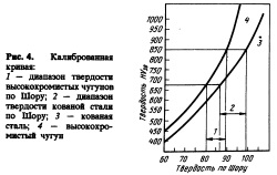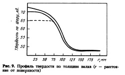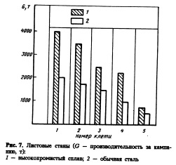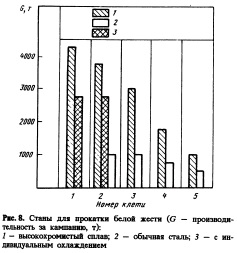 В черновых клетях валки нового типа используют как прямую замену обычных литых валков из белого чугуна с ненаправленной кристаллизацией. Поскольку выщербление поверхности валков в этих клетях является главной проблемой, переход на валки из высокохромистого чугуна резко повышает срок их службы. В средних клетях определенная степень шероховатости важна для обеспечения необходимого захвата. Технологическую смазку также следует изменить для обеспечения необходимого равновесия сил, а стрела прогиба должна быть скорректирована для обеспечения правильной геометрии листа. Типичные данные по износу валков в средних клетях приведены на рис. 7 и достигают значений (Ки для валков из высокохромистого чугуна; Кс— для валков из обычной стали): Главные факторы, обуславливающие применение валков из высокохромистого чугуна в этих станах, сводятся к следующему: а) меньший износ при обычной эксплуатации;б) меньшая потребность в правке поерхности; в) меньшие повреждения при авариях стана; г) отсутствие необходимости в периодическом восстановлении твердости поверхности. Чистота поверхности холоднокатаного листа очень важна в случае производства автомобильного листа, и мы столкнулись с тем, что высокохромистые валки создают "пыль". Однако установлено, что эта "пыль" не является выделением с поверхности валков за счет их износа, а наоборот, представляет собой мелкие частицы стали с поверхности листа, прилипающие и приваривающиеся к поверхности роликов. Как результат такого "пылеообразования" содержание железа в смазке возрастает и увеличивается приваривание к поверхности металла и валков этой "пыли". "Пыль" может быть удалена с листа посредством проведения его очистки перед отжигом. Проблемы чистоты поверхности листа подробно рассмотрены в работе [4], где показано, что они успешно решаются путем использования правильных технологических смазок и соответствующих добавок. Станы тандем для прокатки жести [3]. Валки из высокохромистого чугуна используются во всех клетях, но чаще всего в тех из них, где нагрузки высоки и стальные валки в связи со своим невысоким сопротивлением износу имеют недостаточный срок службы. В чистовых клетях очень важным является управление величиной прогиба валков, поскольку это оказывает решающее влияние на равномерность толщины тонкого листа. Характерные данные по износу валков: 8000 т/мм для изготовленных из высокохромистого чугуна; 2000 т/мм для изготовленных из обычной стали (рис. 8). Главные причины л та применения валков нового типа в этих станах следующие: а) значительное снижение выщербления по сравнению с обычными литыми без направленной кристаллизации; б) увеличенное сопротивление износу в клетях с высокой нагрузкой; в) отсутствие проблем с непрерывнолитыми слябами. Реверсивные станы холодной прокатки [5]. В тех случаях, когда главной проблемой являлось обеспечение высокого качества продукции, были проведены исследования по применению валков, изготовленных из высокохромистого чугуна. Непрерывнолитые слябы из алюминиевых сплавов создают при холодной прокатке тонкую поверхностную пленку с высоким абразивным воздействием на валок, легко и быстро снимающую его поверхностный слой, подвергавшийся дробеструйной обработке, причем это происходит значительно быстрее со стальными валками, чем с валками и