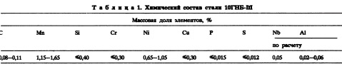 РАЗРАБОТКА ТЕХНОЛОГИИ ПРОИЗВОДСТВА ЛИСТОВОГО ПРОКАТА ДЛЯ КРУПНОГАБАРИТНЫХ КОНСТРУКЦИЙПриведены результаты разработки технологии производства листов толщиной 5—20 мм, шириной до 1500 мм, длиной до 6000 мм из стали марки 10ГНБШ прочностью не менее 400 МПа для крупногабаритных свариваемых конструкций и конструкций морских сооруженийИсходный металл выплавляли в основных дуговых печах ДСП25Н2 переплавом отходов стали 10ГНБ или близких по химсоставу с окислением кислородом, или с полным окислением. Окончательное раскисление в ковше производили прутковым алюминием массой 0,6—0,8 кг/т. Металл продували в ковше гоном в течение 1,5—3 мин. Химический став металла приведен в табл. 1.