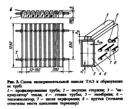 Для ТОЭ и ТАЭ с промежуточной мембраной (рис. 2, б9 в) получены достаточно близкие по уровню температуры разогрева мембран (860 °С при толщине мембраны 1,5 мм и расстоянии между мембраной и металлом 250 мм). В дальнейшем возможно применение алюминия в качестве отражающей поверхности экранов. Анализ выбора материала, удовлетворяющего требованиям эксплуатации ШПС горячей прокатки, приведен в таблице . Для ТАЭ промежуточную мембрану выполнили составной в виде набора горизонтально расположенных труб, наполненных теплоизолятором и расположенных вдоль рольганга [4]. Инерционность системы снизили путем максимального отделения мембраны от основной части каждой трубы; предусмотрели аккумулятор тепла на обратной от металла стороне трубы и разную толщину мембран для труб по ширине рольганга, а также перфорирование стенок труб. При изготовлении труб панелей (рис. 3) с выводом перфорации боковой стенки к мембране полностью устраняется разрушение панелей изза тепловых деформаций.