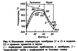 Максимальная температура разогрева мембран центральных труб в среднем на 0,05 tM выше в сравнении с "монолитными" трубами с перфорацией боковых стенок [эффект экранирования раската повышается примерно на 15% (рис. 4)]. ![]()