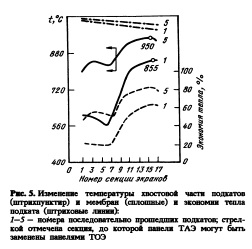 ТАЭ распределения температуры (мембран) по ширине панелей. Усреднения значений указанных температур приводят к заниженным данным в оценке экономии тепла подкатом (в 1,21,35 раза) и его температуры (на 1520 °С). Применительно к ШПС 2000 HJIMK получено (рис. 5), что уже при прохождении первого подката (например, 35x1500x1500 мм) под исходными "холодными" панелями ТАЭ экономиятепла подкатом достигает 60% и температура его хвостовой части повышается на 50 °С (в сравнении с охлаждением на воздухе при наличии окалины на рольганге). На пятом подкате экономия тепла достигает 80% и температура хвостовой части дополнительно повышается на 20 °С. На секциях 1—8 без снижения эффекта экранирования панели ТАЭ могут быть заменены на ТОЭ.