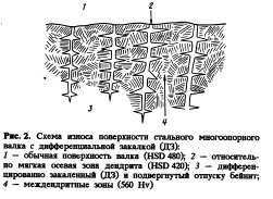 В результате ДЗ обработки поверхностный и подповерхностный слои приобретают структуру бейнита; в структуре встречаются твердые и мягкие составляющие, обусловленные первоначальной кристаллизацией при затвердевании. Например, в случае, если в первичных дендритных зонах макротвердость составляет около НВ420, а в меж дендритных участках около HSD 560, то . твердость поверхностного и подповерхностного слоя должна быть HSD 480. Сочетание заданно распределенных твердых и мягких зон создает высококачественную поверхность, подвергающуюся износу, и повышенное сопротивление износу по сравнению с поверхностью литого валка с эквивалентной твердостью, полученного литьем в .песчаную форму, как показано на рис. 2. Поверхность валков, отлитых в песчаных формах, имеет структуру равноосных зерен без преимуществ заданно распределенных дендритов. Как правило, на поверхности стальных кованых валков зеренная структура включает дендриты, вытянутые параллельно поверхности валка, а также крупные зерна после рекристаллизации. Сопротивление выкрашиванию