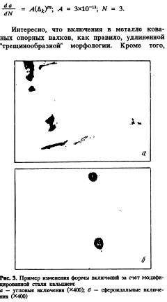 Выкрашивание в опорных валках происходит в основном в двух случаях [3]: 1. Контактная усталость при прокатке вследствие чрезмерной нагрузки главным образом по краям бочки, обусловленной износом между опорным и рабочим валками. 2. Термические и механические трещины, образующиеся при нештатной работе стана (сплющивании или проскальзывании), а также остающиеся после дрессировки валков. Мы изучили типовые механизмы выкрашивания, происходящего в результате контактной усталости при прокатке, так как эта задача легко решалась с помощью улучшения свойств материала. Наблюдение за механизмом усталостного выкрашивания показывает, что оно происходит в местах с большими градиентами наклепа у поверхностной зоны валка, являющегося результатом высоких контактных нагрузок, а это означает, что сведение к минимуму или уменьшение градиента наклепа уменьшит склонность к выкрашиванию [4]. Считается фактом, что в поверхностных слоях валка возникают высокие контактные напряжения и большие градиенты наклепа поверхности, поэтому улучшение свойств материала с целью замедлить начало выкрашивания имеет первостепенную важность. В условиях экстремальных нагрузок и в случае длительного срока службы валка возникают большие упругие напряжения в слое на глубине 100—120 мм от поверхности валка. В тех же зонах действуют пиковые касательные тангенционные напряжения, остаточные радиальные напряжения и напряжения при прокатке. Эти напряжения действуют с самого начала работы валка, но в особенности значительны в опорных валках с больших сроком службы изза большого количества циклических нагрузок. На указанной глубине естественная твердость материала и его усталостная прочность уменьшаются по направлению к более мягкой, но вязкой осевой зоне валка, поэтому увеличивается вероятность возникновения усталостного разрушения. Любая неоднородность будет способствовать возникновению усталости. В этих примерах усталостные трещины были вызваны включениями с острыми краями и углами, попадавшие в металл в процессе выплавки стали так же, как сульфиды U и III типов. Для получения глобулярных оксисульфидных включений РБ Теннент применила введение кальция в жидкую сталь с помощью проволоки в оболочке (5). На рис. 3 показан пример изменения формы включений, когда получены более округлые сульфиды типа 1. Линейные размеры включений уменьшены с 50 до 20 мкм, что увеличило сопротивление возникновению усталостных трещин. Выполненные расчеты (6) показали значительное увеличение срока службы литых стальных опорных валков в результате изменения формы включений. Получены графики для включений номинальным размером 60 микрон и дефектов от 2 до 600 мкм, как показано на рис. 4. Предполагали, что форма включений меняется от плоской с острыми кромками до сферической, напряжения в области 60МН/м2, а уравнение имеет вид: