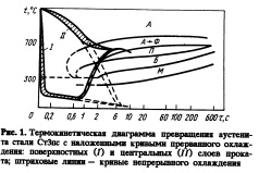 Сложность организации прерванной закалки при термомеханическом упрочнении проката состоит в необходимости обеспечения конечного заданного уровня и равномерности свойств по периметру и длине проката и одновременном сохранении прямолинейности раската как при принудительном, так и дальнейшем естественном охлаждении в процессе непрерывного транспортирования раската по рольгангам и холодильнику. Задачи эти решены для фасонного проката за счет сочетания равномерного охлаждения. по периметру профиля и избирательного охлаждения массивных его элементов; для листов путем автономной регулируемой подачи охладителя на верхнюю и нижнюю плоскости листа. Процесс упрочнения проката осуществляют в линии прокатных станов между чистовой клетью и холодильником. Установки для упрочнения фасонного проката состоят из одной — нескольких секций для охлаждения по периметру проката и встроенного или автономного узла избирательного охлаждения отдельных участков или элементов профиля. Упрочнение толстых листов проводят в свободном (незажатом) состоянии на многосекционной установке ванного типа с независимой и регулируемой подачей охладителя на верхнюю и нижнюю стороны листа. Скорость охлаждения регулируется за счет изменения скорости движения потока воды в устройствах камерного типа, в ванного типа— количеством подаваемой воды. Продолжительность охлаждения до требуемой температуры самоотпуска обеспечивается количеством работающих секций и скоростью перемещения раскатов. Схема охлаждения (прерванное), высокие скорости охлаждения поверхностных слоев проката и слабая прокали ваемость массовых строительных марок стали способствуют созданию в сечении профиля макроструктурной неоднородности (МСН). Степень неоднородности с понижением скорости охлаждения уменьшается. Микроструктура в поверхностных слоях на глубине 1—2 мм представляет собой продукты отпуска мартенсита и бейнита. В центре образуется ферритоперлитная смесь, дисперсность которой на 2—3 балла выше, чем в горячекатаном состоянии. С увеличением степени упрочнения в низкоуглеродистой стали структура центрального слоя трансформируется в квазиэвтек тоид. Прочностные свойства стали с МСН являются агрегатной характеристикой, т.е. аддитивно зависят от прочности поверхностных и центрального слоев. Изменяя технологические параметры, можно регулировать свойства проката в широком диапазоне. Техническими условиями на листовой термомеханически упрочненный прокат толщиной до 32 мм предусмотрено производство классов прочности (по уровню предела текучести) 285, 315, 345, 375, 390; фасонного проката с толщиной полки до 10 мм— 375, 390, 440, 490, 540. При этом относительное удлинение в зависимости от классов прочности составляет 20—16%. Установлено, что термомеханически упрочненный прокат с МСН хорошо сваривается: кристаллизационные и холодные трещины при сварке не образуются; при сварке с использованием соответствующих материалов и режимов обеспечивается равнопрочность шва и основного металла. В серии экспериментов исследовали вклад структурных слоев в общую вязкость металла фасонного проката. Из полки уголка из стали СтЗпс, имеющего по сечению МСН, изготовили образцы таким образом, что одни из них включали только центральный слой, другие — поверхностный и центральный. Ударная вя