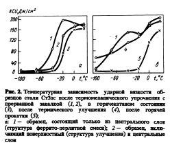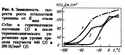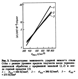 Результаты этих двух экспериментов позволяют утверждать, что существенный вклад в уровень ударной вязкости стали с МСН вносит слоистое строение материала и такую сталь следует рассматривать как естественный композит. Подтверждением эффекта слоистости материала может служить также характер разрушения образцов при надрезе с эффектом торможения трещины. Довольно часто в этих образцах наблюдали расслоение, проходящее по переходной зоне между центральным и поверхностными слоями. Характерной и уникальной особенностью термомеханически упрочненного металла является то, что степень повышения ударной вязкости и хладостойкости находится в прямой зависимости от уровня упрочнения — чем больше степень упрочнения, тем выше хладо стойкость стали (рис. 3). Большие значения вязкости стали с МСН обусловлены как высокими значениями ударной вязкости структур макрослоев, так и эффектом слоистого строения. Рис. 4. Зависимость ско роста роста усталостной трещины от АГтяу стали ^0 СтЗпс в горячекатаном состоянии (О и после 80 термомеханического упрочнения при уровне пре 40 дела текучести 440 (2) и 390 Н/мм2 (3) 0 На толстолистовом прокате из сталей СтЗсп и 09Г2С со структурной анизотропией по толщине определяли переходную температуру остановки хрупких трещин по фрактографи ческому критерию (до 50% вязкой составляющей в изломе) при испытании крупномасштабных образцов (300x75x12—24 мм) по методике ДТТ. Установлена идентичность переходных температур остановки хрупких трещин в сталях с МСН, имеющих более высокую прочность, и в горячекатаных сталях после обычных режимов прокатки. ![]()