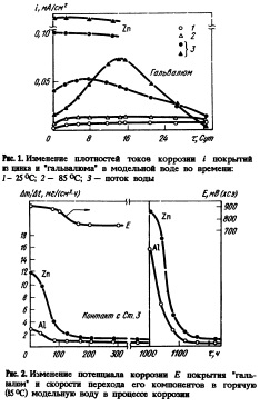 ДВУХСТОРОННИЕ ГОРЯЧИЕ АЛЮМОЦИНКОВЫЕ ПОКРЫТИЯ НА СТАЛЬНЫХ ТРУБАХ ДЛЯ ИСПОЛЬЗОВАНИЯ В СИСТЕМАХ ВОДО- И ТЕПЛОСНАБЖЕНИЯДля систем водо и теплоснабжения прогнозируется повышение в 8—10 раз долговечности труб с Al—Zn—покрытием типа *гальвалюм f относительно труб с Zn—покрытием. Приводится краткое описание комплекса технологических а конструкторских решений для горячего алюмоцинкования стальных труб. Дается анализ экономической целгеообразности замены цинковых покрытий на алюмоцинковысИспользование горячих цинковых покрытий не обеспечивает эффективную ’'защиту и долговечность труб водо и теплоснабжения особенно при повышении температуры воды 60—65 °С [1]. Кроме того, имеет место ухудшение качеств? питьевой воды за счет примеси свинца, привносимой в покрытие с цинком. Горячее алюмоцинковое покрытие (Ni альвалюм", "гальфан" и др.) на стальном листе как альтернатива цинковому уже показало свое преимущество при эксплуатации в атмосферных условиях. На очереди применение горячих алюмоцикковых покрытий для защиты труб водэ и теплоснабжения. Однако в литературе мало данных о коррозионном поведении таких покрытий в горячей и холодной воде. Решение вопроса о преимуществе А1—Znпокрытия в коррозионной стойкости, экономическая целесообразность их использования, а также разработка технологии их нанесения на трубы составляют содержание проведенной работы. Оценка коррозионной стойкости покрытия типа "гаяьвалюМ1 Коррозионноэлектрохимическим испытаниям подвергали отрезки стальных труб (Ст.З) диаметром 20 мм и длиной 100 мм с покрытиями из цинка и сплава типа "гальвалюм". Покрытие "гальвалюм" получали из расплава, % (по массе): А1 55 Zn 43,5 Si 1,6 при температуре 610—620 °С и выдержке 15—20 мин с последующим воздушным охлаждением со скоростью 10грэд/с до 300 °С, а затем медленным остыванием на воздухе. Покрытие (толщиной 26—32 мкм) имело характерную структуру, соответствующую aфазе по диаграмме состояния, с метастабильным эвтектоидом, обогащенным цинком, в междендритном пространстве. Коррозионные испытания образцов проводили на стенде [2], который обеспечивал непрерывный контроль потенциала коррозии внутренней поверхности' трубы с покрытием и возможность периодического снятия его поляризационных характеристик. По этим данным рассчитывали токовый показатель скорости коррозии покрытия. Ускоренные испытания проводили как в потоке (0,9 м/с), так и в его отсутствие в горячей (85 °С) и холодной (20 °С) модельной воде состава, мг/л: [SOT] “ 300; [СГ] 50 с общей жесткостью 0,5, что соответствует весьма жестким условиям эксплуатации труб. Установлено, что скорость коррозии покрытия "гальвалюм" в наиболее агрессивных условиях (в потоке воды при 85 °С) в начальный период по крайней мере' в S^IO раз меньше, чем у Znпокрытия (рис. 1). Со временем наблюдается ее снижение до величины, составляющей ~1/30 от скорости коррозии Znпокрытия.