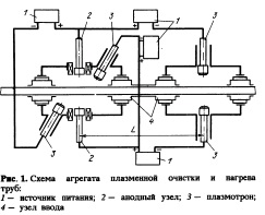КАТОДНАЯ ЗАЧИСТКА И НАНЕСЕНИЕ ПОКРЫТИЙ НА ПОВЕРХНОСТЬ ПРОКАТАОписана новая многоэлектродная установка для очистки поверхности металлического проката перед нанесение на него антикоррозионного покрытия, не имеющая аналогов в отечественной и зарубежной плазменной техникеТехнологическая и экологическая целесообразность требует создания принципиально новых процессов очистки поверхности металлического проката перед нанесением на него антикоррозионного покрытия. .Одним из прогрессивных является метод очистки поверхности, основанный на плазменно-дуговой катодной обработке. Его преимущества перед традиционными механическими и химическими методами следующие: компактность технологического агрегата; соответствие современным экологическим нормам; простота извлечения отходов; высокая производительность при сравнительно малой энергоемкости процесса. Результатом настоящей работы явилось создание принципиально новой многоэлектродной установки, не имеющей аналогов в отечественной и зарубежной плазменной технике. Конструкция опытной установки представляет собой вакуумную камеру с тремя типами плазменных устройств: плазмотронами, анодными узлами, узлами ввода обрабатываемого изделия (рис. 1). Основное назначение плазмотронов — создание стабильной, локализованной области плазменной проводимости в зоне рабочего разряда, энергия которого расходуется на удаление с поверхности изделия окалины, оксидной и масляной пленок и дрны могут быть использованы также для нагрева изделия в процессе его очистки до заданной температуры. Анодный узел обеспечивает замыкание электрических цепей через разрядные промежутки на положительные полюса двух источников питания: основного источника и источника питания плазмотрона. Анодный узел состоит из анода, заключенного в водоохлаждаемый корпус через изолятор. Для управления плотностью тока на токовоспринимающей поверхности анода, а также для стабилизации плазменных разрядов аксиальным магнитным полем на корпусе анодного узла расположен соленоид, выполненный из медной трубки. Основной функцией узла ввода является локализация зоны катодной зачистки на по-верхности обрабатываемого изделия в определенных границах. Сильноточный дуговой разряд на холодном катоде — обрабатываемом изделии — существует в виде множества катодных микропятен, перемещающихся по его поверхности, их количество находится в прямой зависимости от тока разряда. Причем существенно следующее: местом преимущественной привязки большинства катодных пятен является граница между чистой поверхностью и поверхностью металла, покрытой оксидной или другой диэлектрической пленкой. Это обусловлено тем, что на указанной границе благодаря высокой напряженности электрического поля происходит автоэмиссия электронов, которые, участвуя в актах ионизации, вызывают появление здесь катодных микропятен. Энергия, доставляемая к поверхности катода из канала разряда через его опорное пятно, расходуется в основном на испарение диэлектрической оксидной пленки. Перемещаясь фронтом перпендикулярно границе, катодные микропятна оставляют за собой абсолютно чистую металлическую поверхность. Процесс катодной зачистки может быть описан уравнением: