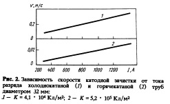 На рис. 2 приведены зависимости скорости зачистки от тока разряда для двух типов труб. Исследован процесс плазменной очистки поверхности полосового проката и труб с последующим нанесением покрытий на экспериментальной установке. Определено влияние на энергетический режим и качество обработки поверхности межэлектродных расстояний, магнитного поля соленоида, тока плазмотрона, тока основного разряда, расхода газа, давления. Получены образцы холоднокатаных и горячекатаных труб и полосы с участками очищенной от оксидной пленки и окалины поверхности, а также с покрытием нитридами титана, циркония и бронзы. Разрабатывается технологическое оборудо-вание для очистки поверхности полосового проката и нанесения на его поверхность композиционных покрытий типа бронз для вкладышей подшипников, нержавеющих сталей для сельхозтехники, износостойких покрытий типа карбидов титана и ниобия для вкладышей штампового инструмента и пластин режущего инструмента и т.д., а также химически чистых металлов типа медь, никель, алюминий для нужд электротехники СБОРНИК НАУЧНЫХ ТРУДОВ Черная металлургия России и стран СНГ в XXI веке. Т о м 5, Москва 1994 |