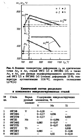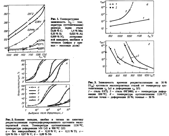 На рис. 1 показано влияние ниобия, ванадия и титана на рост зерна аустенита при нагреве. По возрастанию сдерживающего влияния на рост зерна аустенита элементы располагаются в последовательности: V, Nb, Ti. Микролегирующие элементы оказывают различное влияние на кинетику рекристаллизации горячедеформированного аустенита малопер-литной стали (0,10 % С, 1,5 % Мп, 0,30 % Si, 0,03 % Al) (рис. 2.). При температурах >900 °С ванадий практически не влияет на скорость рекристаллизации аустенита. Напротив, ниобий и титан весьма эффективно тормозят рекристаллизацию. При температурах <900 °С разупрочнение деформированного аустенита в сталях с ниобием (~0,04—0,08% Nb) или с титаном (~0,08—0,11 % Ti) практичеки не наблюдается, в то время как в нелегированной С—Mn-стали такое явление отмечается лишь при температурах ~800 °С. Ниобий наиболее сильно тормозит рекристаллизацию деформированного аустенита Процессы выделения карбонитридов ниобия и титана значительно ускоряются под влиянием деформации аустенита. Максимум стимули-рованного деформацией выделения карбонитридов ниобия наблюдается при температуре около 925—900 °С, карбонитридов титана — около 870-875 °С карбонитридов ванадия— ниже 850—800 °С. Это наблюдение позволяет объяснить более высокую способность ниобия по сравнению с титаном к сдерживанию рекристаллизации аустенита при горячей пластической деформации и слабую при этом роль ванадия. На рис. 3 показано влияние условий горячей пластической деформации в широком интервале температур 750+1100 °С на кинетику рекристаллизации малоперлитных сталей. В качестве параметра принято время, необходимое для протекания рекристаллизации на 50 %. Из рис. 3, а видно, что повышение температуры аустенитизации приводит к замедлению процесса рекристаллизации горячедеформированного аустенита простой С—Мп малоперлитной стали, что обусловлено в основном ростом зерна аустенита. Еще в большей мере повышение температуры аустенитизации влияет на замедление рекристаллизации стали, микролегированной ниобием и ванадием. Это связано с дополнительным влиянием таких факторов, как повышение содержания этих элементов в твердом растворе при повышении температуры, а также с последующим выделением под влиянием горячей пластической деформации частиц карбонитридов ниобия и ванадия, тормозящих протекание ре-кристаллизации. Снижение температуры деформации (рис. 3, б) аустенита также замедляет его последующую рекристаллизацию. Для С—Mn-стагли основной причиной этого явления является уменьшение скорости диффузии, а для микролептрованной стали большую дополнительную роль играет усиление выделения частиц Nb, V (С, N) под влиянием деформации при понижении температуры деформации. Для С—Mn-стали после деформации ниже 850 °С и для С—Mn—V—Nb-стали ниже 950 °С рекристаллизация в значительной степени подавлена. На рис. 4 показано влияние температуры деформации на критические точки у —> a-превращения малоперлитных сталей: простой С—Мп (0,09% С, 1,5% Мп) и мик- ролегированной С—Mn—V -Nb-стали (0,04 % Nb и 0,07% V). Видно, что деформация повышает температуру начала и окончания распада аустенита. При этом с понижением температуры деформации от 1100 до 800 °С наблюдается рост критических точек начала распада горячедефор- мированного аустенита Аг^ и окончания распада Аг^ Точки Лг%еф и Arfe