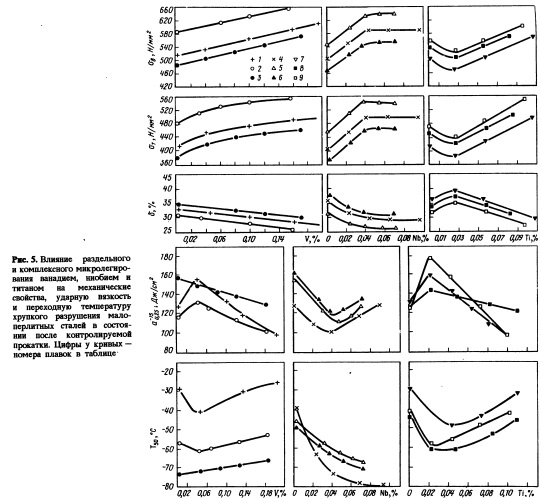 При достаточно низкой температуре дефор-мации, превышающей точку Аг3 недеформиро-ванного аустенита не более чем на 50— 60 °С, распад аустенита начинается непосредственно в процессе деформации, т.е. наблюдается "динамическое" у —>а-пре- вращение. Область динамического распада го- рячедеформированного аустенита, т.е. распада, происходящего во время приложения усилия прокатки, для C-Mn-стали (для данных условий эксперимента) лежит при температурах <770 °С, для С—Mn—V—Nb-стали при температурах <790 °С. Деформация при более высоких температурах инициирует "статическое" у —> a-превращение, начинающееся через не-которое время после завершения деформации. Влияние микролегирующих элементов на механические свойства малоперлитных сталей На рис. 5 обобщены результаты исследований по влиянию раздельного и комплексного микролегирования ниобием, ванадием и титаном на механические свойства малоперлитной стали (0,08-0,10 % С; 1,4-1,6 % Мп; 0,15- 0,20 % Si; 0,003-0,006 % S; 0,04 % А1; 0, 010—0,012 % N) в состоянии после контролируемой прокатки (толщина листа 17 мм; температура нагрева 1150 °С; температура окончания прокатки 740—760 °С; степень обжатия 65% при температурах ниже 900 °С; охлаждение на воздухе). Условные обозначения плавок и содержание в них микролегирующих элементов приведены в таблице. С увеличением содержания ванадия проч-ностные свойства малоперлитной стали монотонно возрастают (<гв увеличивается на 5 Н/мм2 на каждые 0,01% V). Микролегирование ниобием обепечивает на-иболее интенсивное повышение прочности при увеличении его содержания до 0,04—0,05 %, что соответствует пределу растворимости карбонитрида ниобия при температуре нагрева 1150 °С. Величина <гв возрастает на 20Н/мм2 на каждые 0,01 % Nb. Образующиеся при более высоком содержании ниобия при нагреве до 1150 °С относительно крупные частицы Nb(C, N) размером более 10 нм не принимают непо-средственного участия в дисперсионном уп-рочнении стали. Некоторое снижение прочности при введении ’ стехиометрических добавок титана (0,02—0,03 %) обусловлено рафинированием феррита от азота вследствие его связывания в нитрид TiN, выделяющийся при высоких температурах в виде крупных частиц. Дальнейшее увеличение содержания титана приводит к возрастанию количества дисперсной фазы типа TiC (частицы размером 2—10 нм), активно упрочняющей феррит. При этом Положительное влияние малых добавок Ti (0,02-0,03%) и V (-0,04%) на ударную вязкость и переходную температуру Т^ малоперлитных сталей связано с измельчением зерна и уменьшением концентрации азота в феррите. При более высоких содержаниях указанных элементов преобладает эффект дисперсионного упрочнения и наблюдается снижение ударной вязкости. При температурах полностью вязкого раз-рушения упрочняющее воздействие микродобавок ниобия (до -0,04%) приводит к снижению ударной вязкости. Введение ниобия в количествах, превышающих предел растворимости карбонитрида Nb(C, N) в аустените при тем-пературе нагрева, способствует некоторому повышению ударной вязкости даже при полностью вязком изломе, по-видимому, вследствие уменьшения доли перлита в структуре стали. Характер совместного влияния ниобия, ванадия и титана на прочностные свойства и пластйчность малоперлитных сталей подобен влиянию этих элементов в более простых сталях типа 09Г2Ф, 09Г2Б и 09Г2Т и носит аддитивный характер. Механизмы, обусловливающие влияние ниобия и т